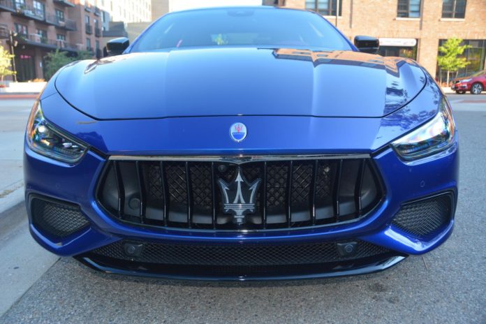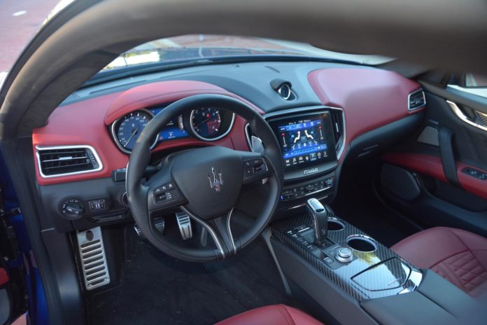 The automaker didn’t say how long the craftsmen spent on the interior, only noting that it took 85 hours to make the tool required for the embroidered accents on the seats. Thread colors in Blu Amon, Blu Cepheus, and Bianco Leda are meant to suggest waves and wash against the primary cabin colors of Blu Delphinus and the lighter Blu Amon. Even the start button gets in on the wavy look, a Blu Mira Carbon plaque on the rear bulkhead acting as a signature for the artwork.