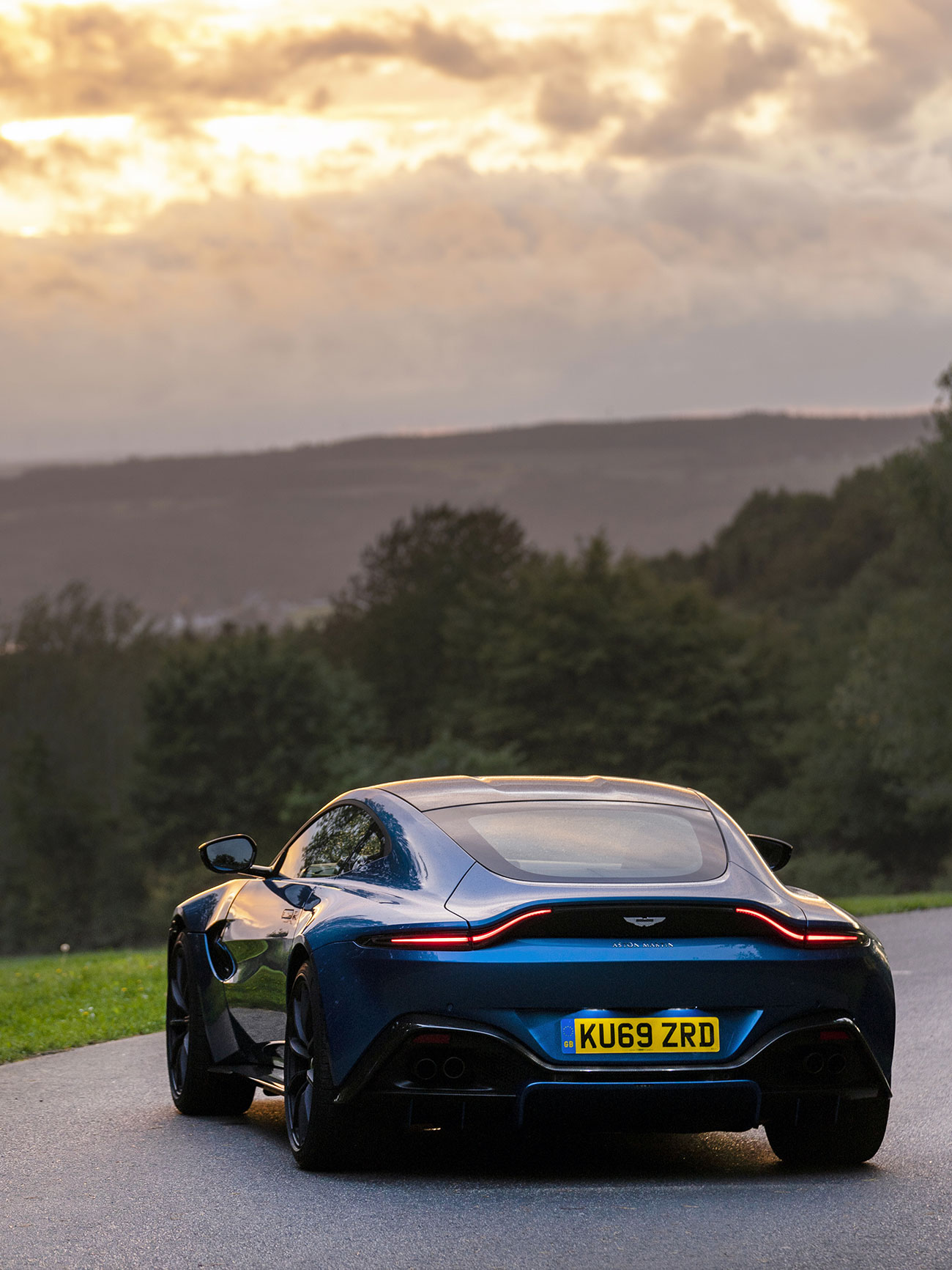 The other two teasers show provide peeps of the rear fascia. A carbon fiber centerpiece bears Aston Martin lettering. At the corners, seven stacked LEDs on each side form a pair of pillar-style taillights in a design we’ve not seen on any recent vehicle, and they light up in sequence from bottom to top. It also seems a full-width light bar connects the upper few taillight elements across the rear of an integrated Kamm tail, the tail being a more shapely version of the backside on the Aston Martin Valour.