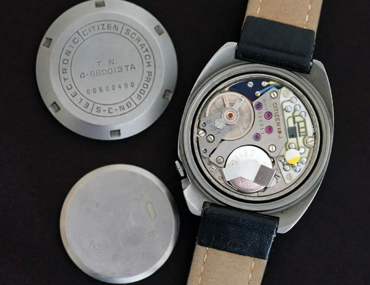 Titanium’s use should’ve been considered groundbreaking at the time, but it’s not even emphasized on the dial or case back — a “T.N.” text next to the serial number is the only overt marker on the watch. Citizen, rather, chose to highlight the watch’s movement: You’ll find “electronic” on the dial and case back, and “chronometer officially certified” alongside an electric-looking logo on the dial. As that designation indicates, this was a highly accurate movement.