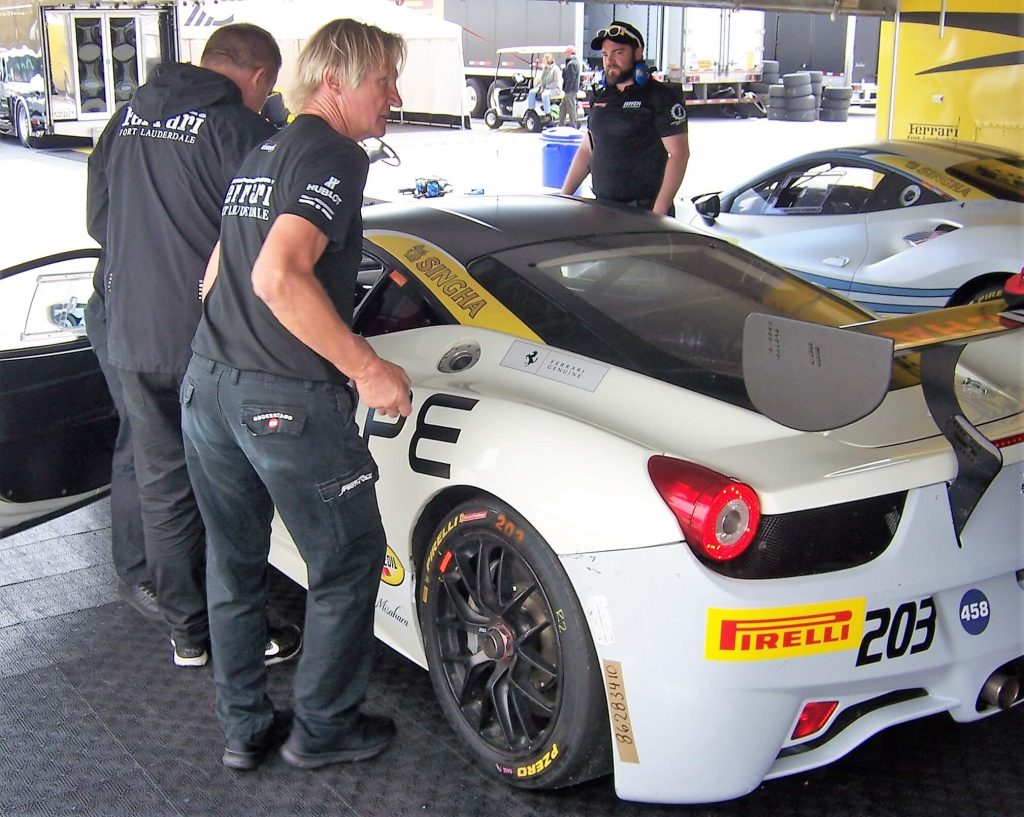 For sure, walking through the extensive paddocks is always a fascinating excursion. My several tours through different segments of the paddocks revealed plenty of activity – mechanics preparing the cars to race by mounting new rubber from tall stacks of fat, sticky tires, getting fuel into the tank, and doing the myriad of other activities required to get cars on the track. Often team members assist the driver in getting situated inside the car, which sometimes involves a lengthy discussion.