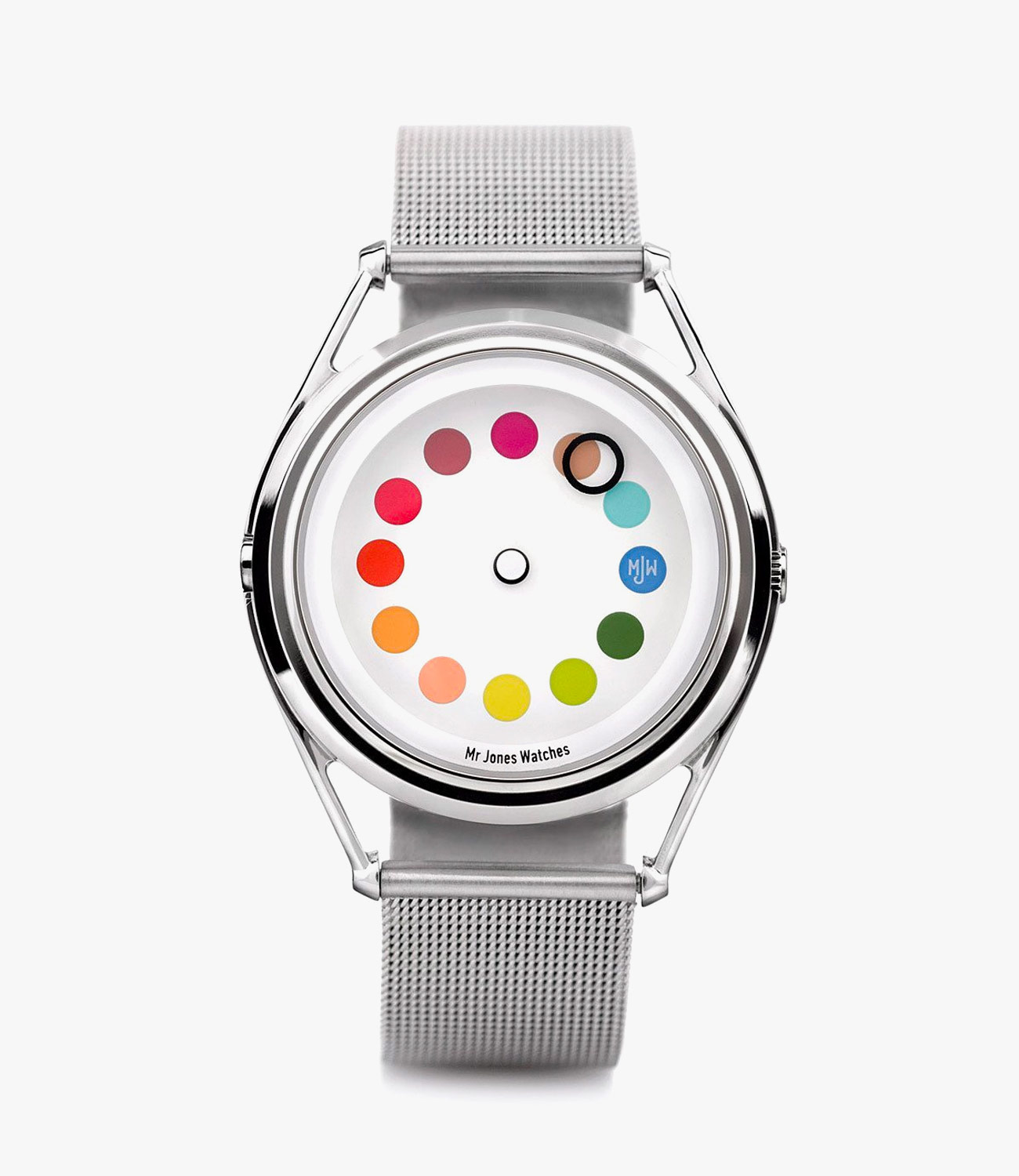 Want to tell time without telling the time? Crispin Jones has a few options for you. This one, which indicates the hours and minutes quite brilliantly using stationary circles rather than markers and a moving circle rather than hands, has color, unique style, and the right price tag.
