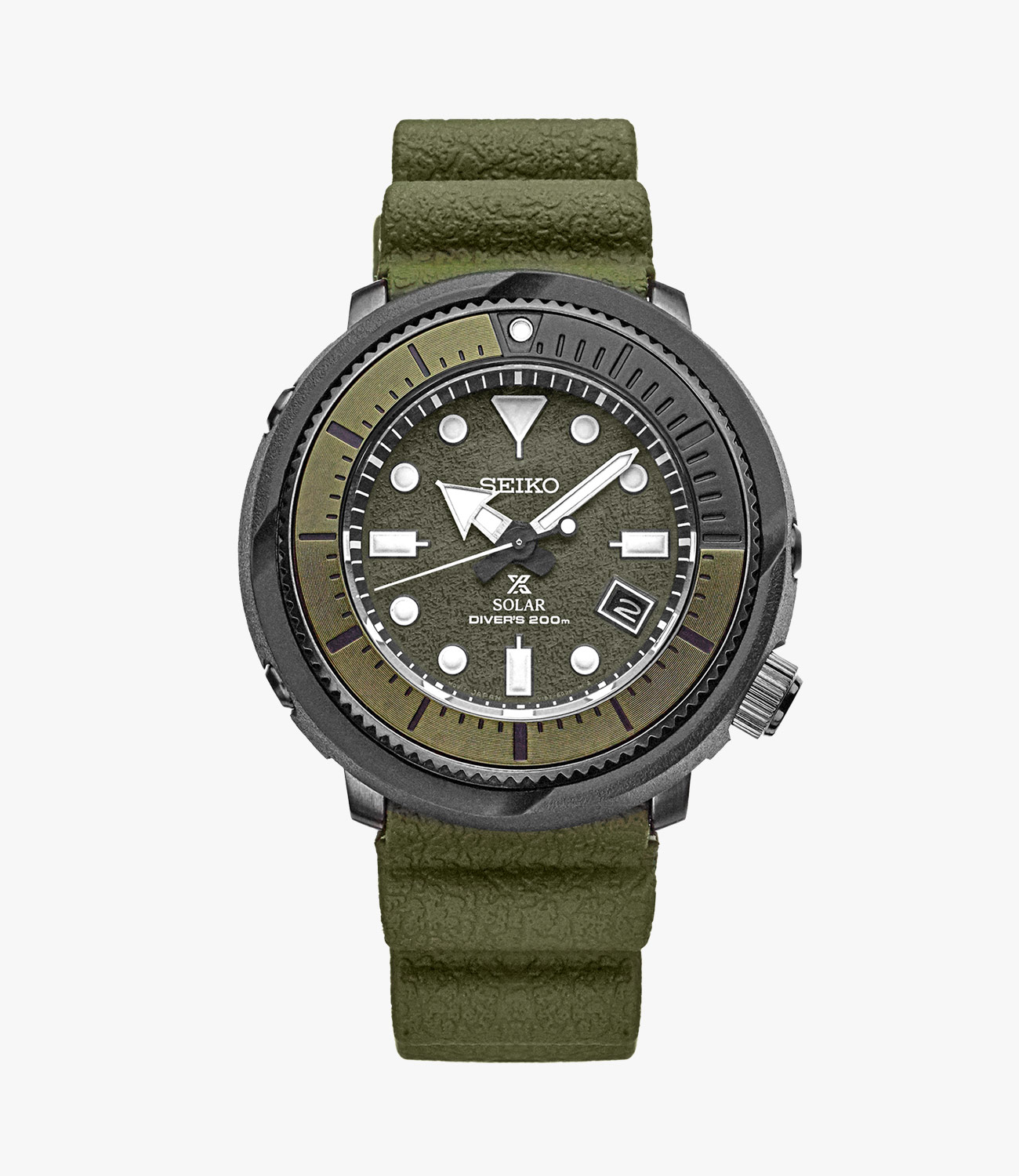 These are modeled after the iconic 1975 “Tuna Can” Seiko diver, with a summery twist: all three models have a low-key, monotone design, in either camo green, gray, or deep blue. They’ve got street style, plus a solar-powered movement that’ll run forever given some sun, and the unbreakable addition of a stainless steel case covered in a protective shroud. If you can wear a 51mm watch, this ought to be your go-to for adventures.