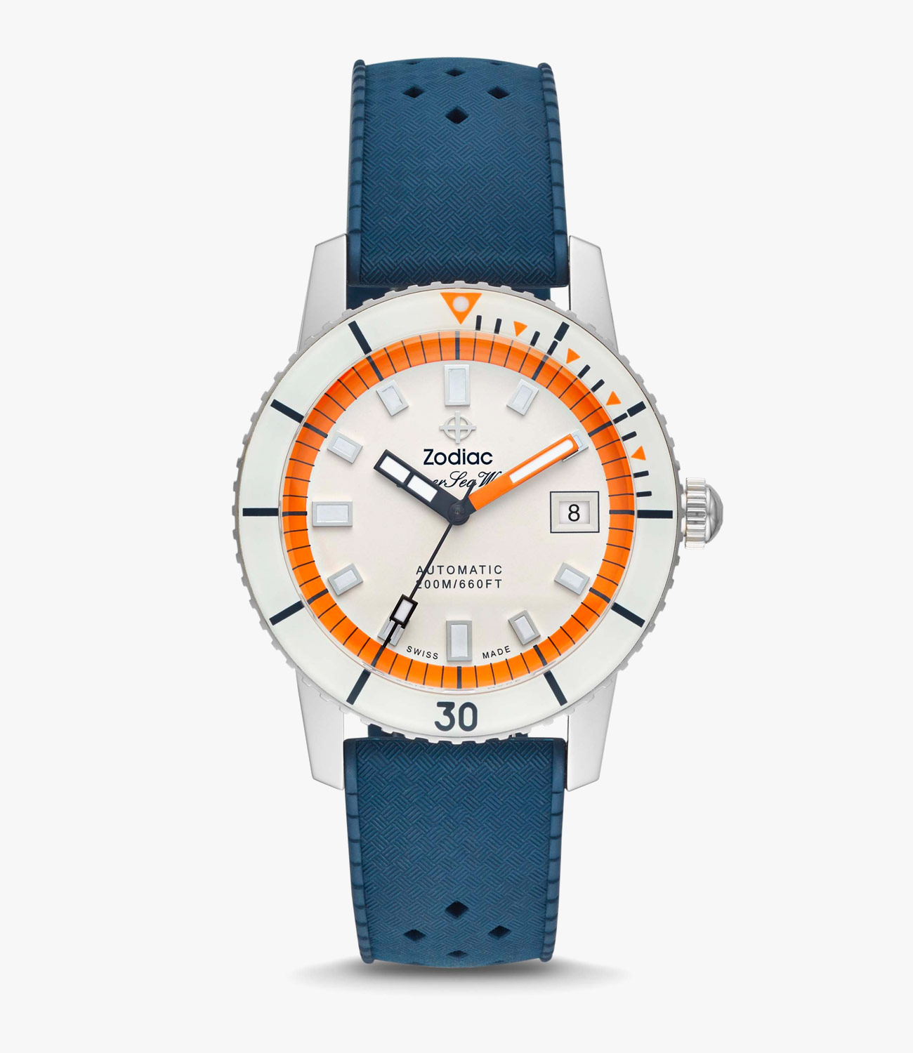 A fun ‘60s throwback to one of the first dive watches (ever!). Yes, the original’s 35.5mm has ballooned up to 40mm, which is bad news for the small watch lover—but everybody ought to love the wild white, orange, and blue colorway.
