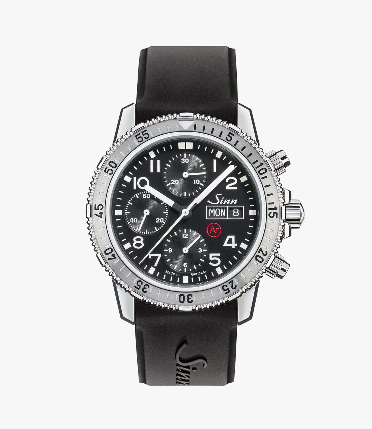 Sinn’s new chronograph is water-resistant to 300 meters, and resistant to low pressure and humidity. But its best asset may be how damn cool its toothed bezel and black dial look on a black silicone strap.
