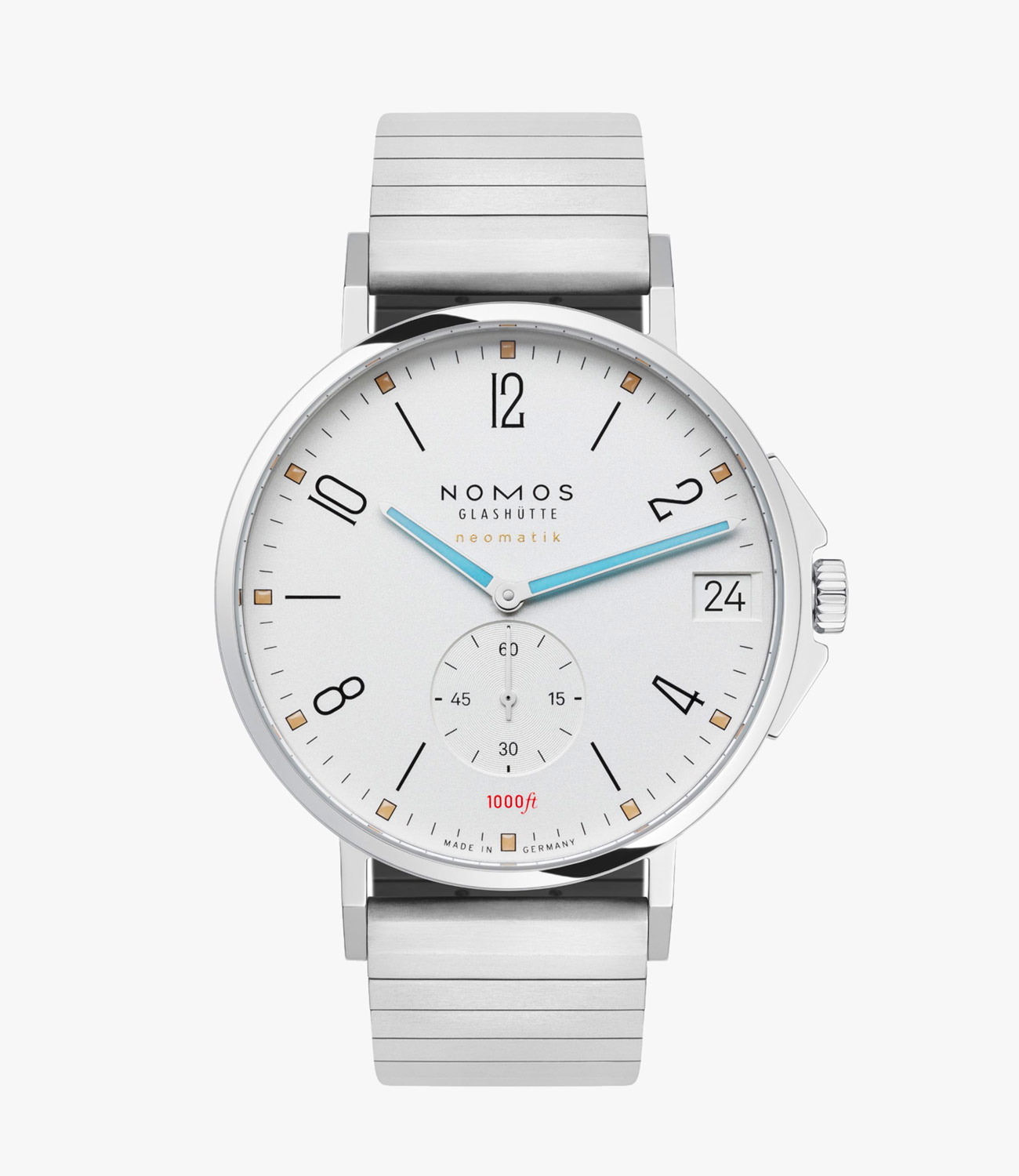 An asymmetric crown guard adds a perfectly sporty touch to the dressed-up NOMOS Tangente Sport. The new version, with either a black or white dial, has “vault-like” proportions and build, extra SuperLuminova, and most notably, a beautiful, extra-segmented bracelet. Think “fancy, cool art gallery opening.”