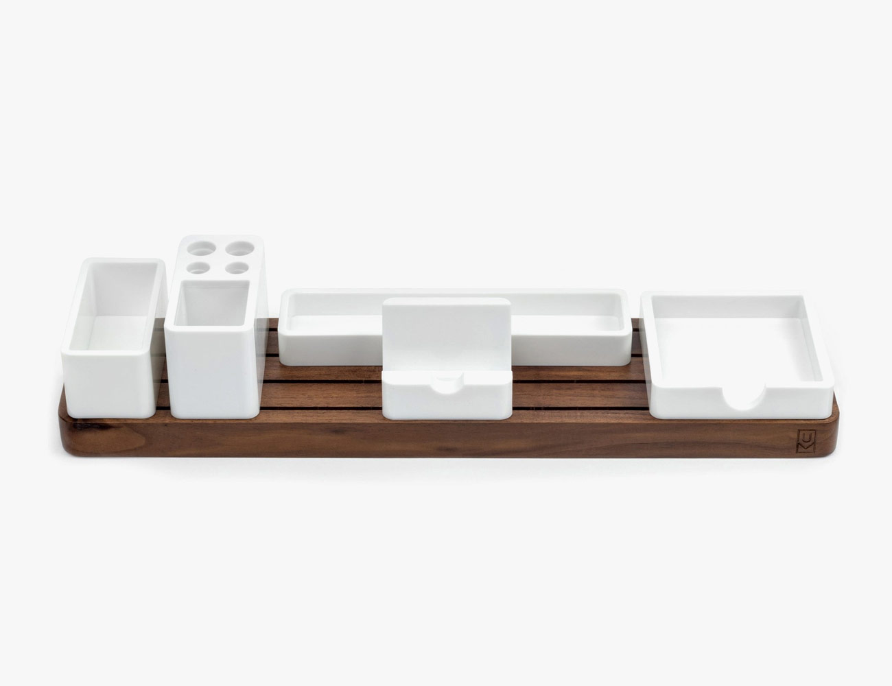 A desk organizer made by someone who was sick of ugly, oddly cumbersome desk organizers. The first set has six mini ceramic organizers neatly fitted to either a maple or walnut board, and the second level adds on a cupholder and a headphone stand because, you know, why not.