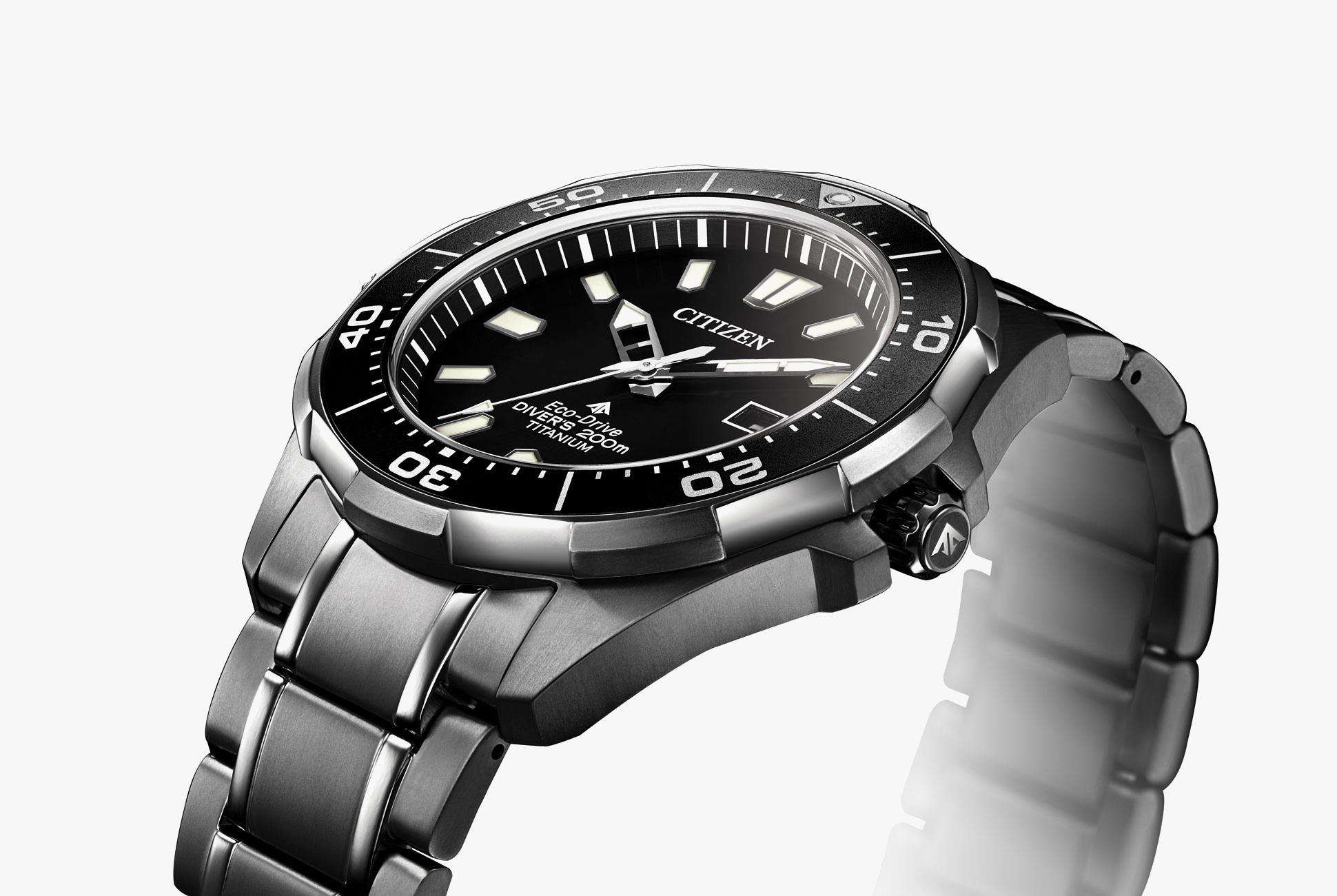 Key Features: Solar-charged quartz movement. Titanium case and bracelet. Water resistant to 200 meters