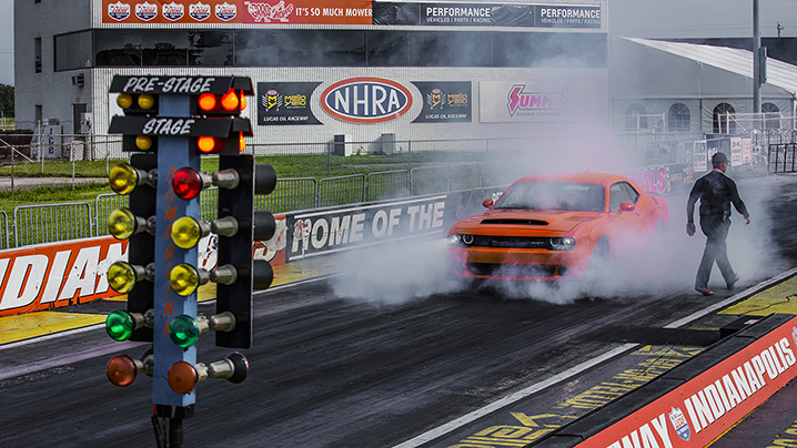 There are multiple ways to launch the Demon. We had an instructor sitting in the passenger seat as we pulled up to the beams that trigger the Christmas tree at Lucas Oil Raceway. He walks us through the most complicated of the three he had explained to us just minutes before when we were in the passenger seat. With our left foot on the brake, we pull on both of the shifter paddles on the back of the steering wheel. Next, we gingerly apply throttle with the right foot, bringing the RPMs up to between 1,100 and 1,200, and let go of one paddle. “Off the brake,” the instructor tells us. Overriding every bit of our muscle memory from years of driving that tells us it’s a bad idea, we lift our left foot. Our finger on the remaining shift paddle is what keeps us still.