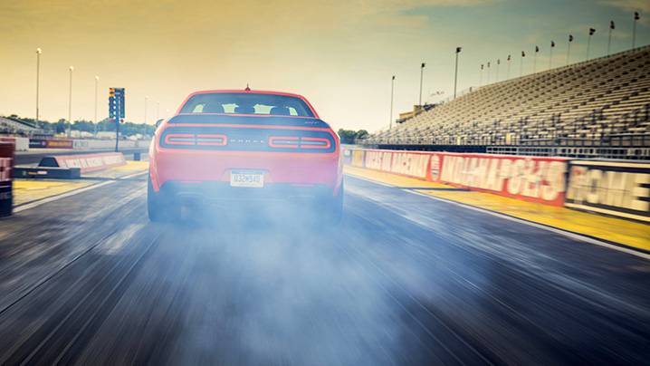 A second time, we roll up the windows, pull through the water box, spin our tires, and set up our run. A second time, our instructor walks us through the launch procedure. This time, a little more confident, we let go of the second paddle and dig into the accelerator, though not nearly as smoothly as our first launch. The rear wheels hop, but eventually bite and the Demon takes off. We’re glad just to be headed straight as the dizzying G forces build and release, build and release as the car rows through its gears.