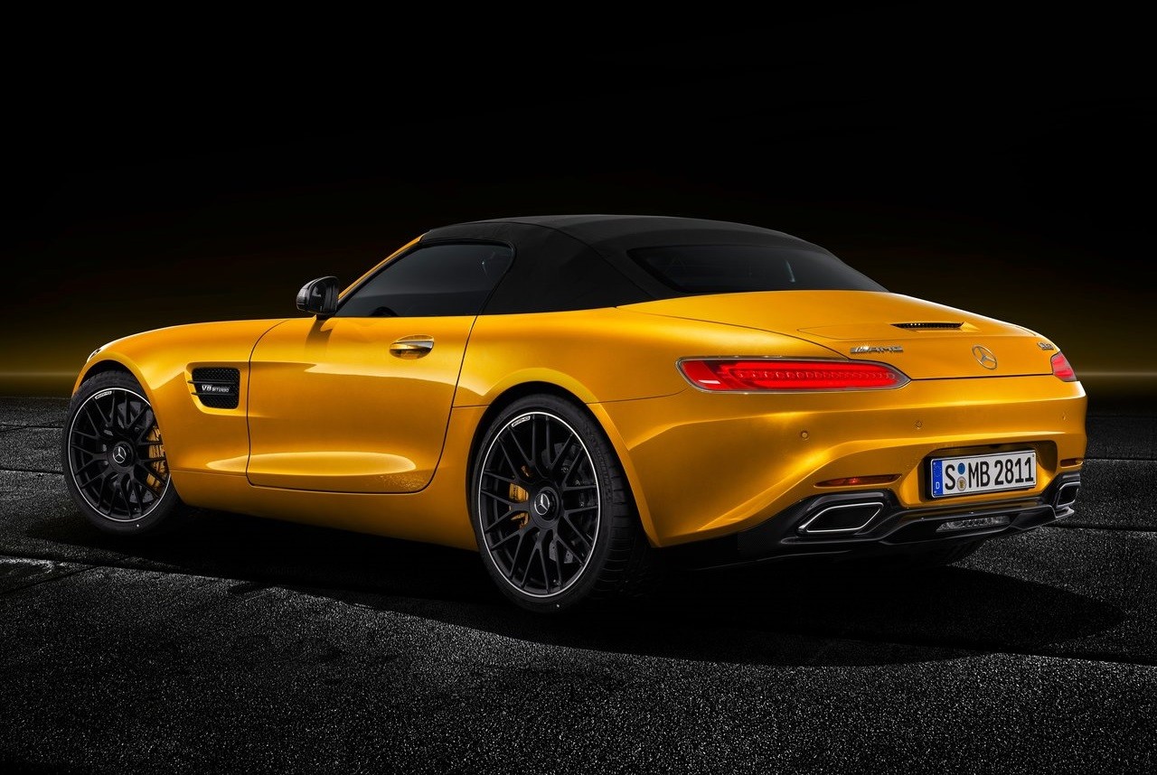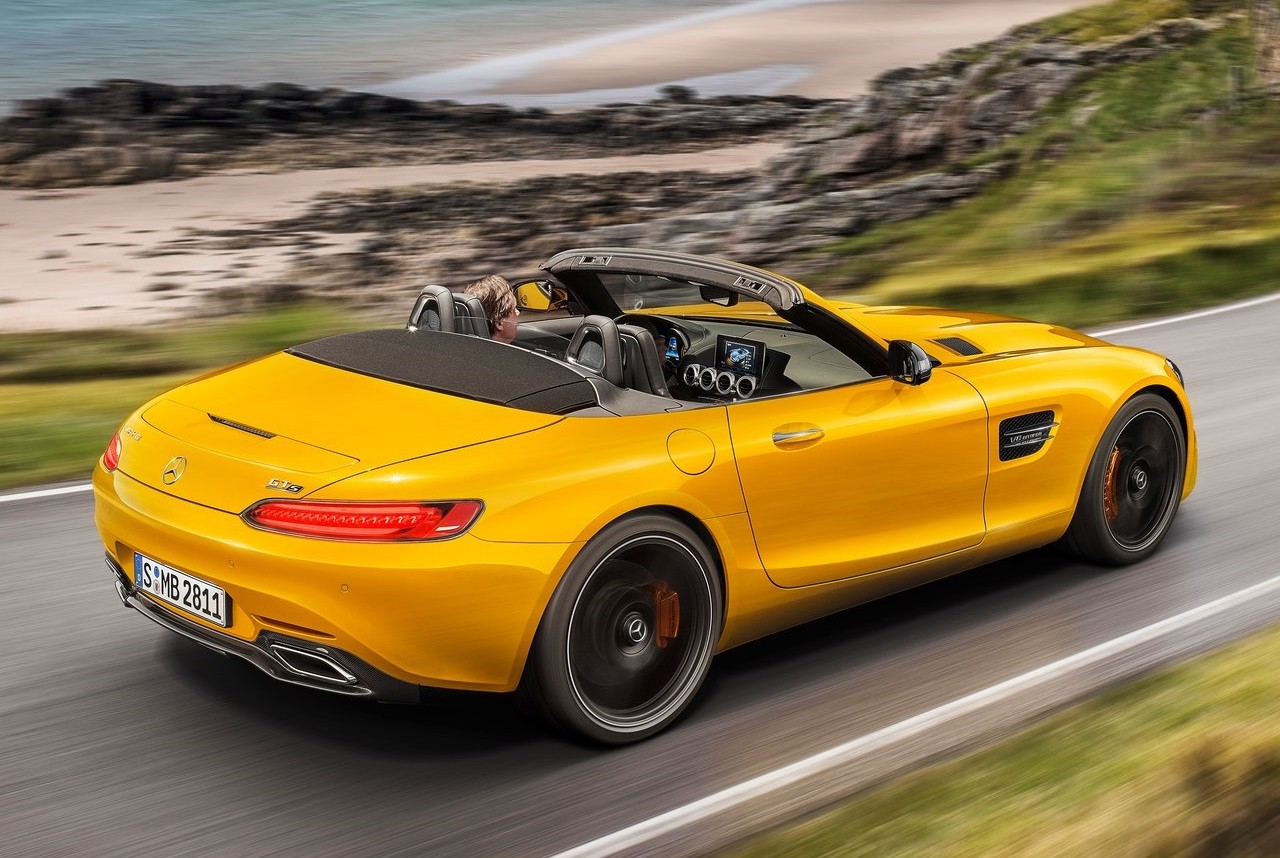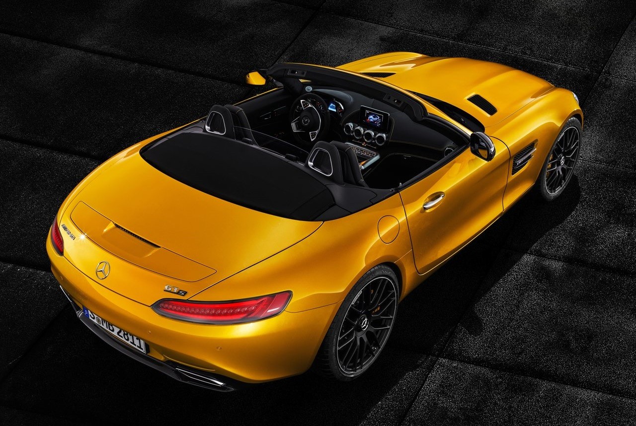 The 2019 Mercedes AMG GT S Roadster is the 12th and latest member of the AMG GT series. This extremely yellow open-top 2-seater is powered by a handcrafted, 4.0L V8 Biturbo engine delivering 515 hp, making for a 0-60 time in 3.7 seconds and a top speed of 192 mph.