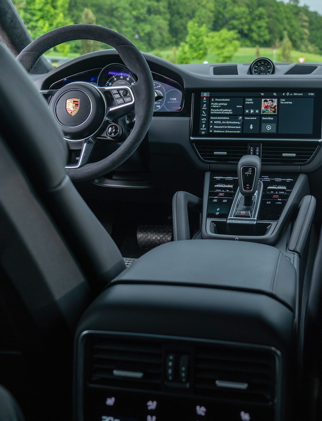 The equally adept handling and performance revealed itself on a drive around Graz, Austria, featuring some sensationally smooth and challenging roads that the Coupes made quick work of. Though the mechanicals are the same as the two-box version, there are some tweaks that nevertheless enhanced the ride. The Coupe comes with an active rear spoiler that can extend by 5.3 inches above 56 mph, to increase rear downforce. There’s also a lightweighting option that replaces the standard panoramic glass moonroof with a carbon fiber roof, and 22-inch aluminum wheels that are each 4.4 pounds lighter than conventional alloy ones. The total weight savings on the Coupe: up to 48 pounds. It may not seem like much in a 5,000-pound car, but it does make a difference, both in the unsprung weight of the wheels and since dropping weight from the roof also has the effect of lowering the center of gravity, thereby enhancing cornering ability. These are very much the higher-performing Cayenne models.