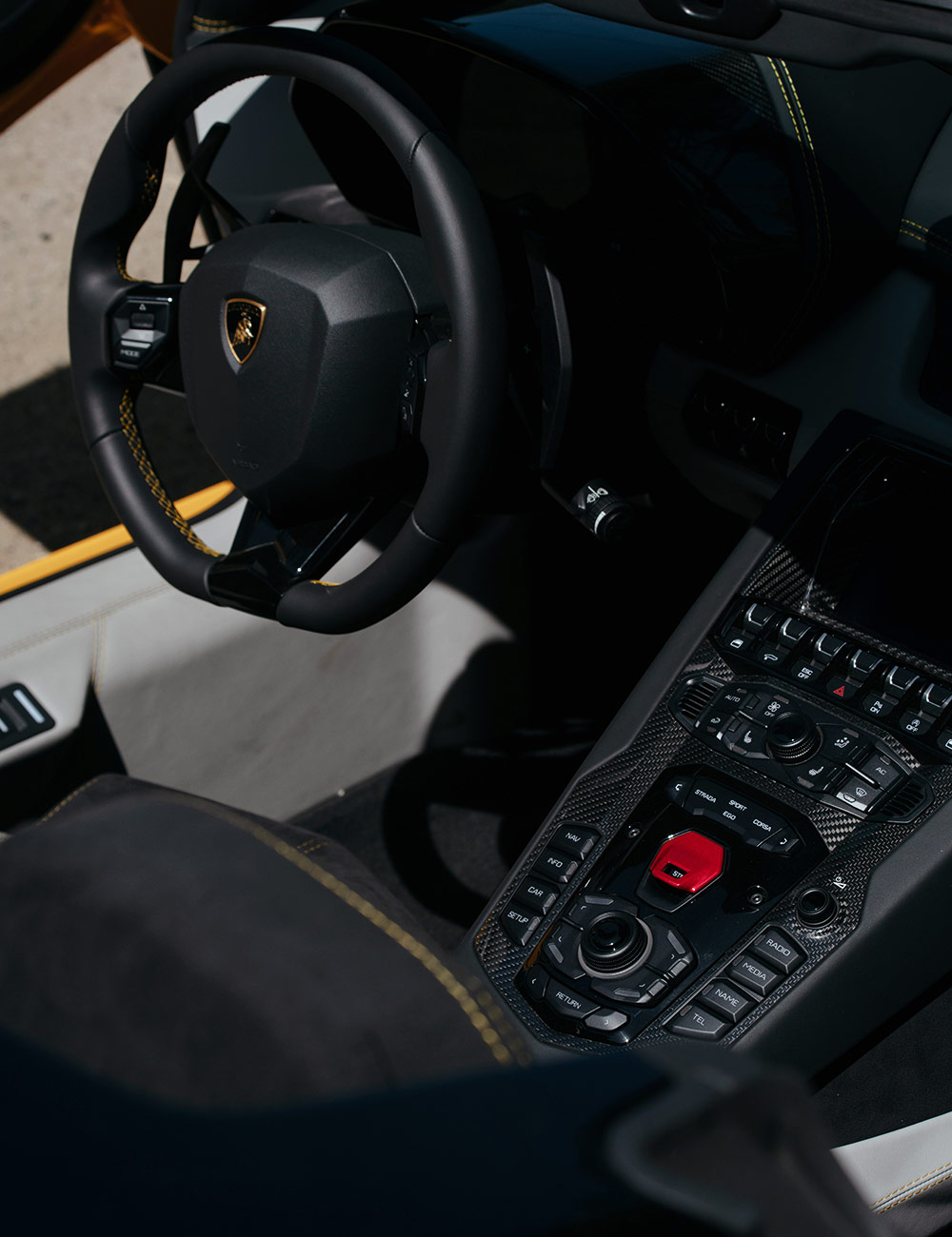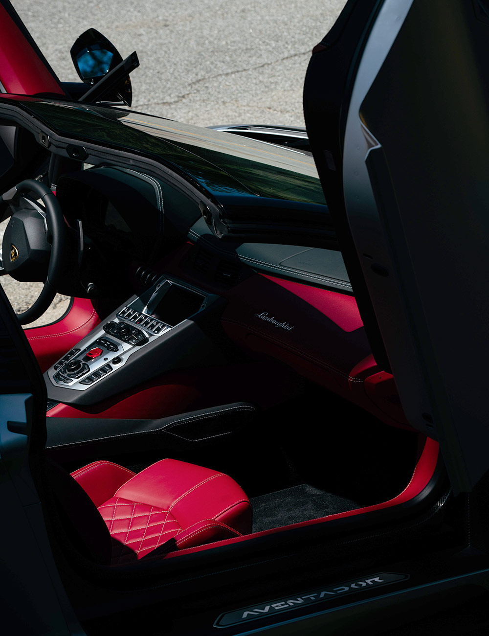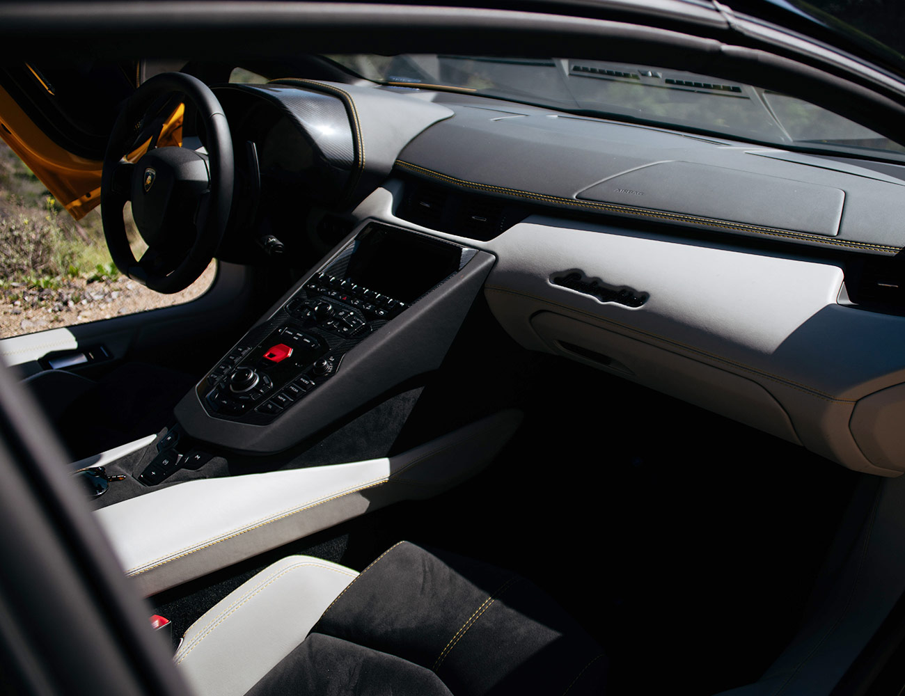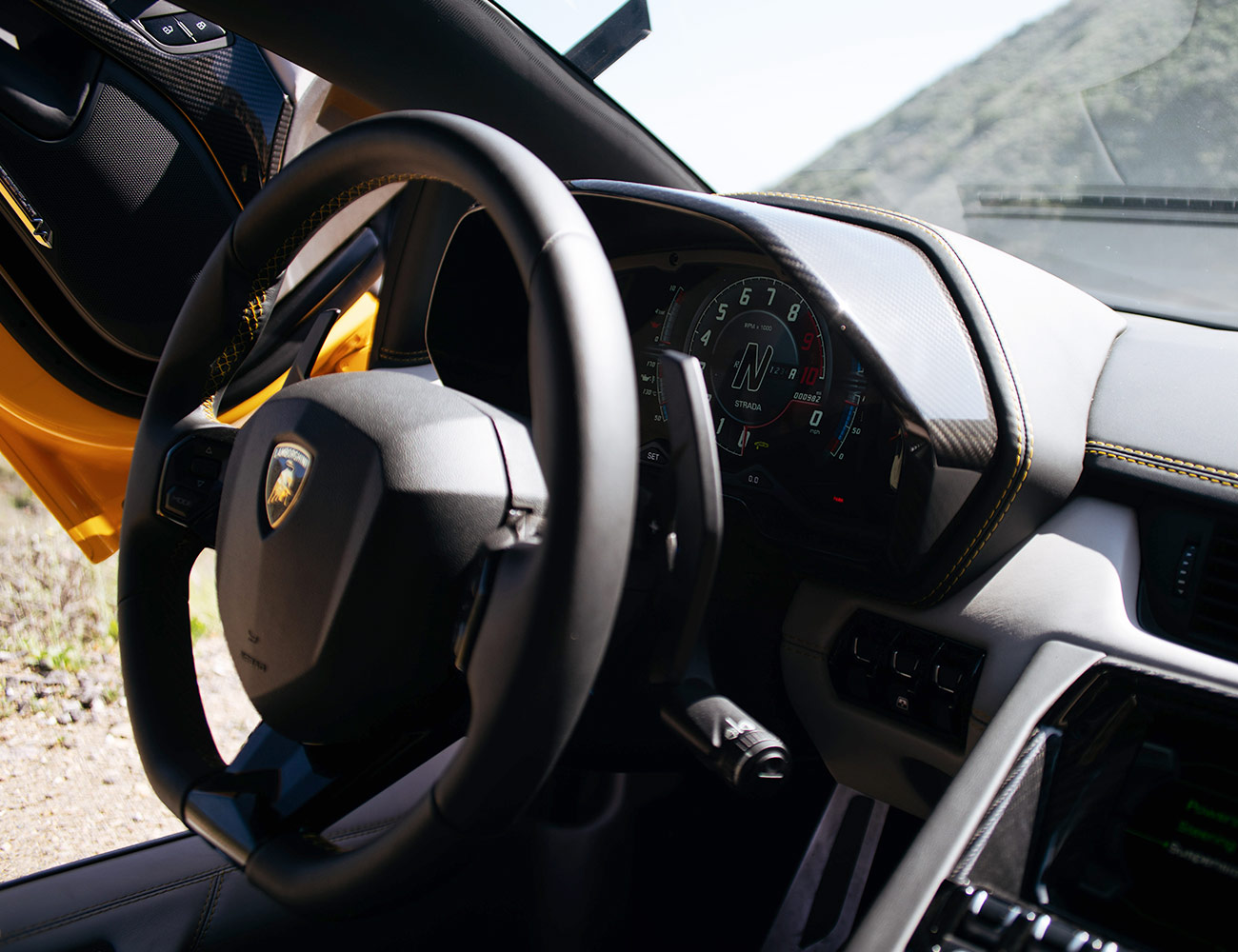 While the seats are crazy comfy, I’d recommend the lower, optional mounting rails available though Lamborghini’s personalization program, Ad Personam, in order to reduce the likelihood of loose gravel or any other road debris connecting with your head.