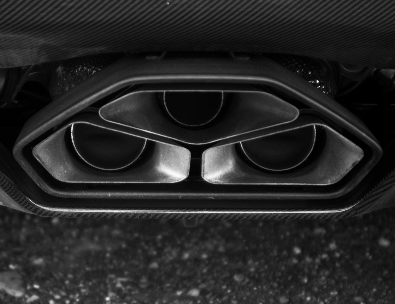 The triangle offense, greater than the Pyramids of Giza: the new triple outlet exhaust of the Aventador S Roadster. Surrounded by carbon fiber and tuned to perfection, these three pipes unleash a most glorious assault on any ears within a few mile radius. 20 percent lighter than its predecessor, this beautiful exhaust system produces the kind of noise usually reserved for on-track competition.