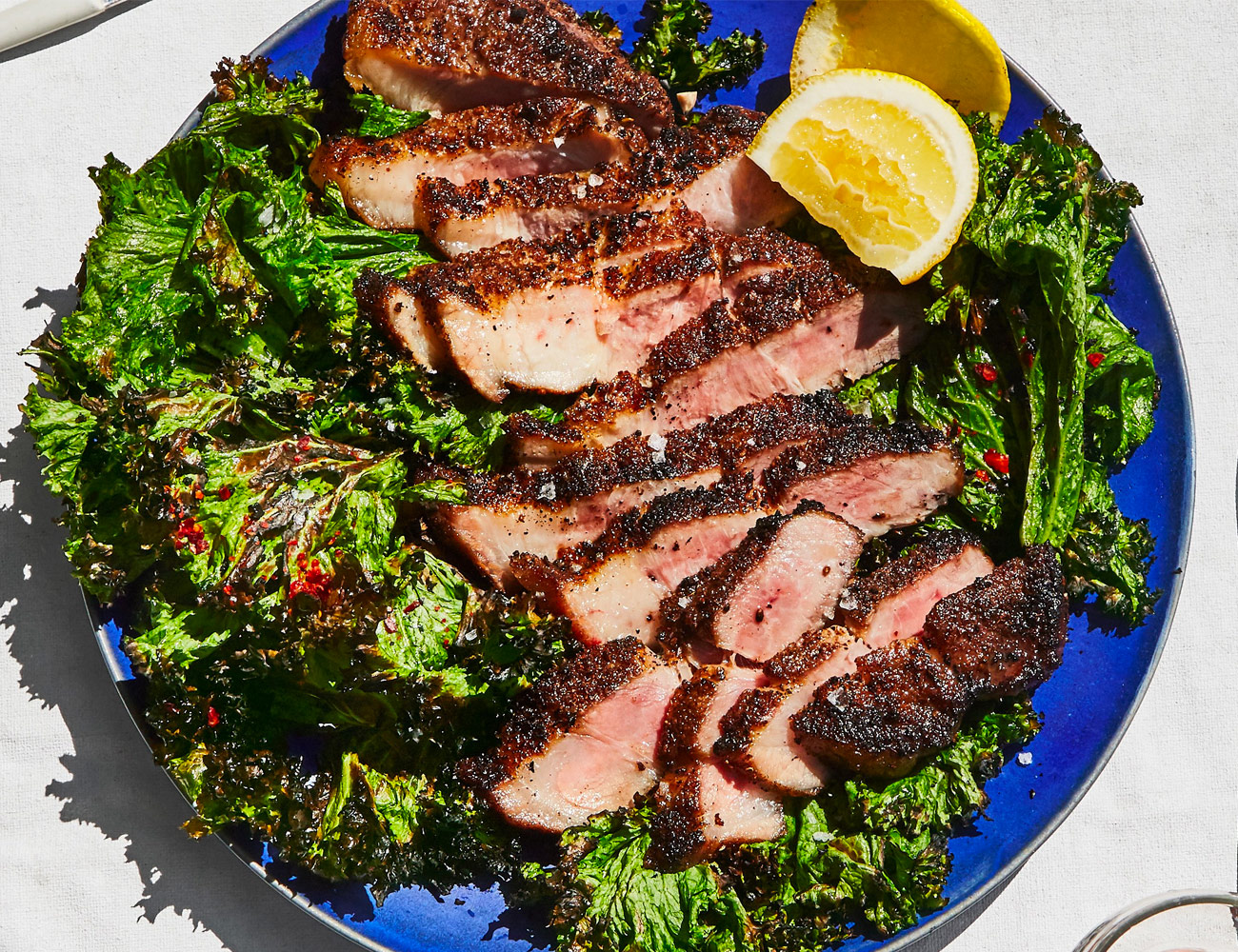 Grilled Pork Shoulder Steaks with Mustard Greens