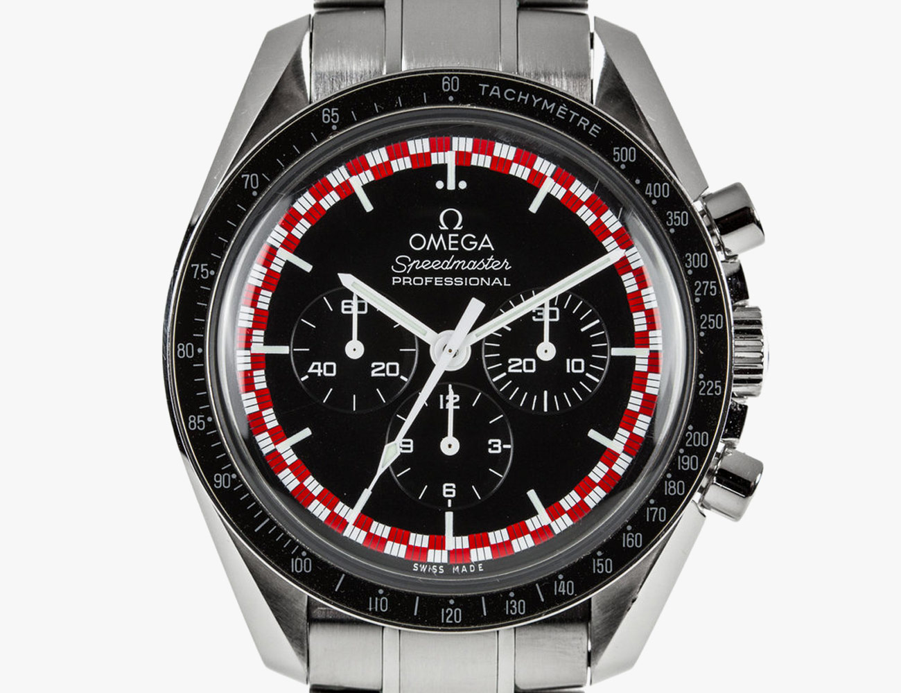 What we like: Launched in 2013 then discontinued shortly thereafter, this Speedmaster was, according to Fratello Watches, initially born as an homage to the Tintin comic “Destination Moon.” The red-and-white chapter ring is based on the design of the rocket in the comic, and the prototype featured a more overt reference to Tintin, but the publisher of the comic wasn’t on board. The Tintin association was axed, but the watch’s red-and-white dial lived on ever so briefly as a “Racing” variant, though few were made and sold.