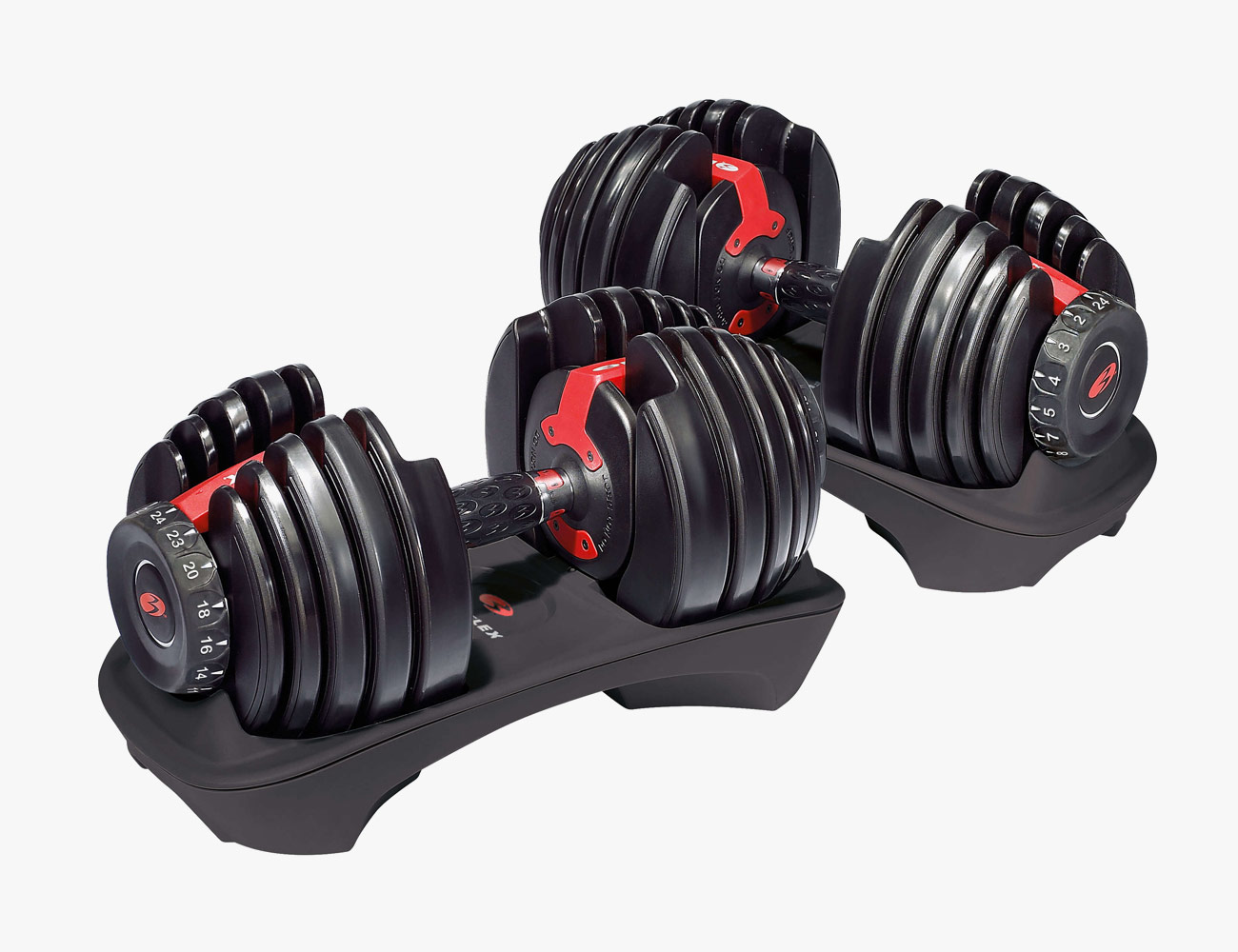 “Having free weights is a no-brainer when it comes to strength training. Not everyone has the room or money to put an entire cable system or barbell rack in their home gym, but there are a few options. Most people I train have a few sets of weights — usually 7, 12.5 and 15 or 20-pounds — however, Bowflex makes an incredible adjustable set that I love.”