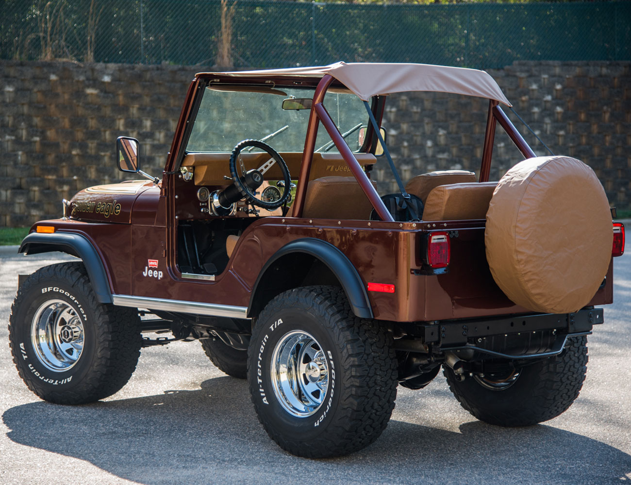 From the seller: “First produced as a low-production special edition in 1977 but proved to be so popular that it was offered through 1980. The package featured Golden Eagle lettering on the sides of the hood, a large eagle decal on the top of the hood, over-sized tires, and a decor and convenience group. This example is finished in a dark brown with a tan soft top and matching Levi’s interior, and the truck has been lightly modified with a Rough Country lift and 33-inch tires. The 304ci AMC V8 is backed by a manual transmission, and a service is being performed in preparation for the auction. ”