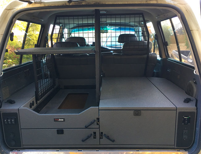 After saving a bit of money on the rooftop tent, I can binge on a high-quality storage system. Trekboxx builds a custom-fit, modular arrangement for 80 Series Land Cruisers that they claim will outlast your truck. Specifics of the Alpha system include Accuride drawer slides, a full cargo barrier, shelf, and fridge barrier system, one shallow drawer, one full-size drawer and coating for all in UV stable color-matched LINE-X. Additional accessories like a worktable, outlets, and switches can be added based on your needs, but the standard system is impressively tidy and well built.