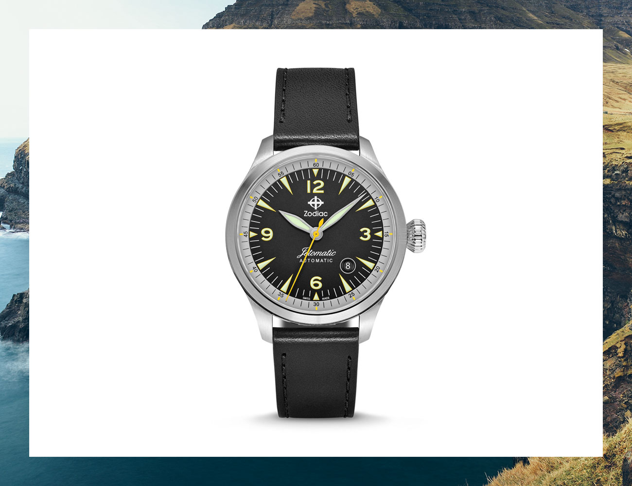 Something for more formal, year-round wear is this watch from Zodiac. Modeled after pilots watches from the 1960s, this piece features a big dial, an oversized crown and Super-LumiNova coated hands driven by a Swiss-made automatic movement.