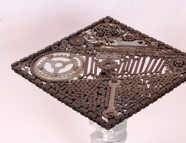 At first glance, this looks like a repurposed piece of modern art, thanks to a crankshaft’s inherently odd yet organized design. Add in a drive chain and spockets for an interesting take on a side table. This one probably belongs in the den or your office.