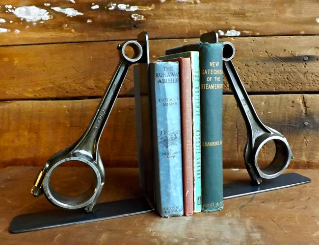 What better way to hold up your entire new collection of motoring literature than an industrial set of connecting rod bookends? They’d pair incredibly well with a worn, rustic, dark wood book case and come off as bluntly elegant in the process.