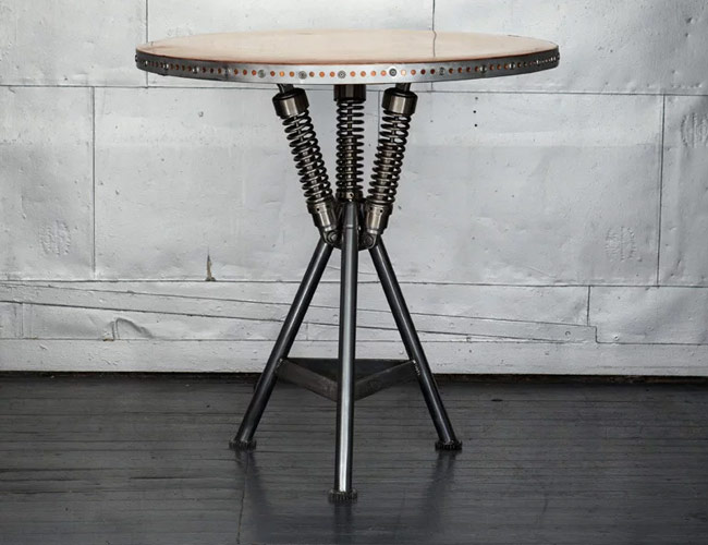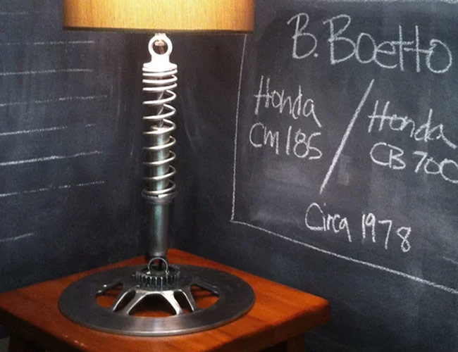 Each suspension lamp is handmade, built with a spring, shock and fork tubes from ’70s and ’80s Japanese motorcyles. Sitting on an end table, it has a nice industrial design to it, without seeming overtly upcycled. Jay Leno owns one, so definitely legit.