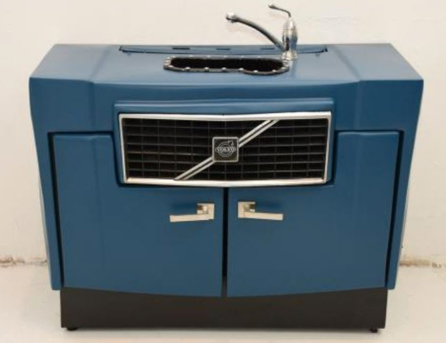 Aside from the Volvo grille and logo across the front, this vanity, sink and cabinet combo has a beautiful mid-century feel to it. The oil pan sink basin is nice touch too.