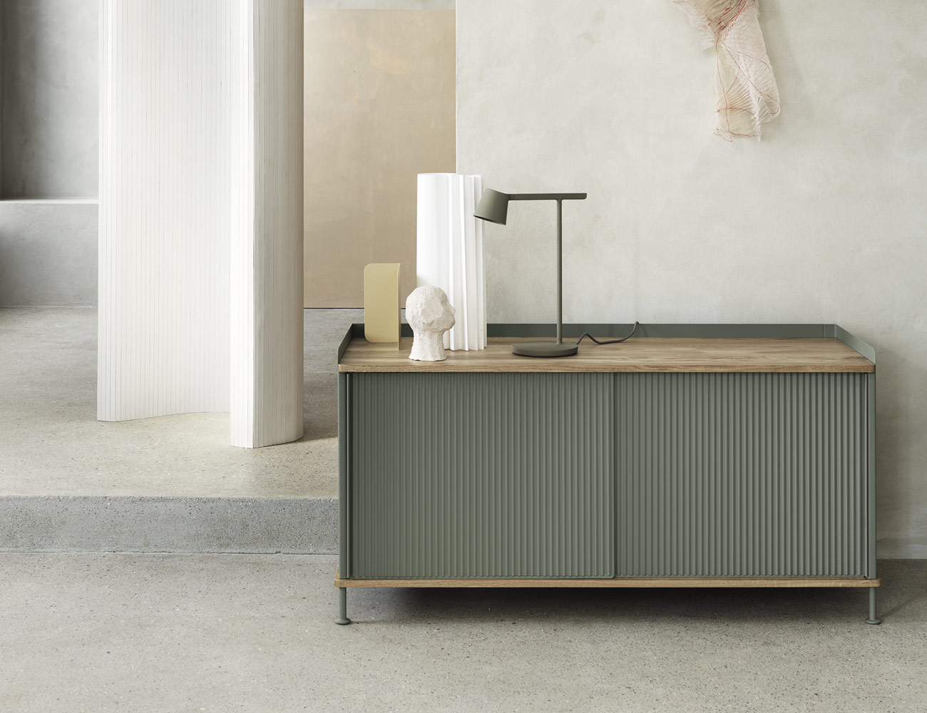 Muuto, an abbreviation of the finnish word muutos, means “new perspective.” That’s how the scandinavian-grounded approaches making its wide catalog of lighting, home accessories and furniture. The Enfold Sideboard Low reeks industrial — a bent and lacquered steel body doubles as a slide open door to reveal a modular shelving unit, and both the base and top surface are solid oak. Often troublesome to track down, Muuto products can be found in a surprising number of stores stateside.