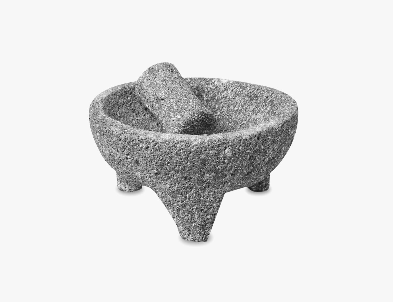 Calling a molcajete a guacamole serving plater is tantamount to calling a cast-iron skillet a wall ornament. The molcajete is the Mexican answer to the mortar and pestle, but with one significant difference – it’s porous. The basalt rock used to make a traditional molcajete is covered in tiny little holes that help it do what it does best – crush spices, chunkier sauces and rubs. Notice the word crush. A molcajete is not for grinding or emulsifying. It’s a tool to just barely crack open garlic, whole seed spices or small veggies. It doesn’t hurt that it’s incredibly satisfying to use. (Pro tip: Crush uncooked white rice in yours before using it for the first time. The rice will catch and remove the sandy, gritty particles on the top layer of the bowl so they don’t get in your food.)