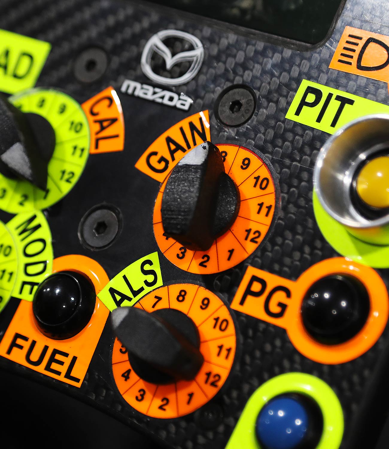 Modern top-tier race cars are exponentially more electronically complicated than their forebearers. Before the advent of traction control, the driver’s right foot took care of managing grip. Before shifter paddles were bolted to the back of the wheel for quick shifts and seamless gear changes, drivers were doing it all manually. Engine revs and speed, those were on the dash. Now, cars like the Mazda RT24-P put all of those operations and more on the wheel solely on the steering wheel.