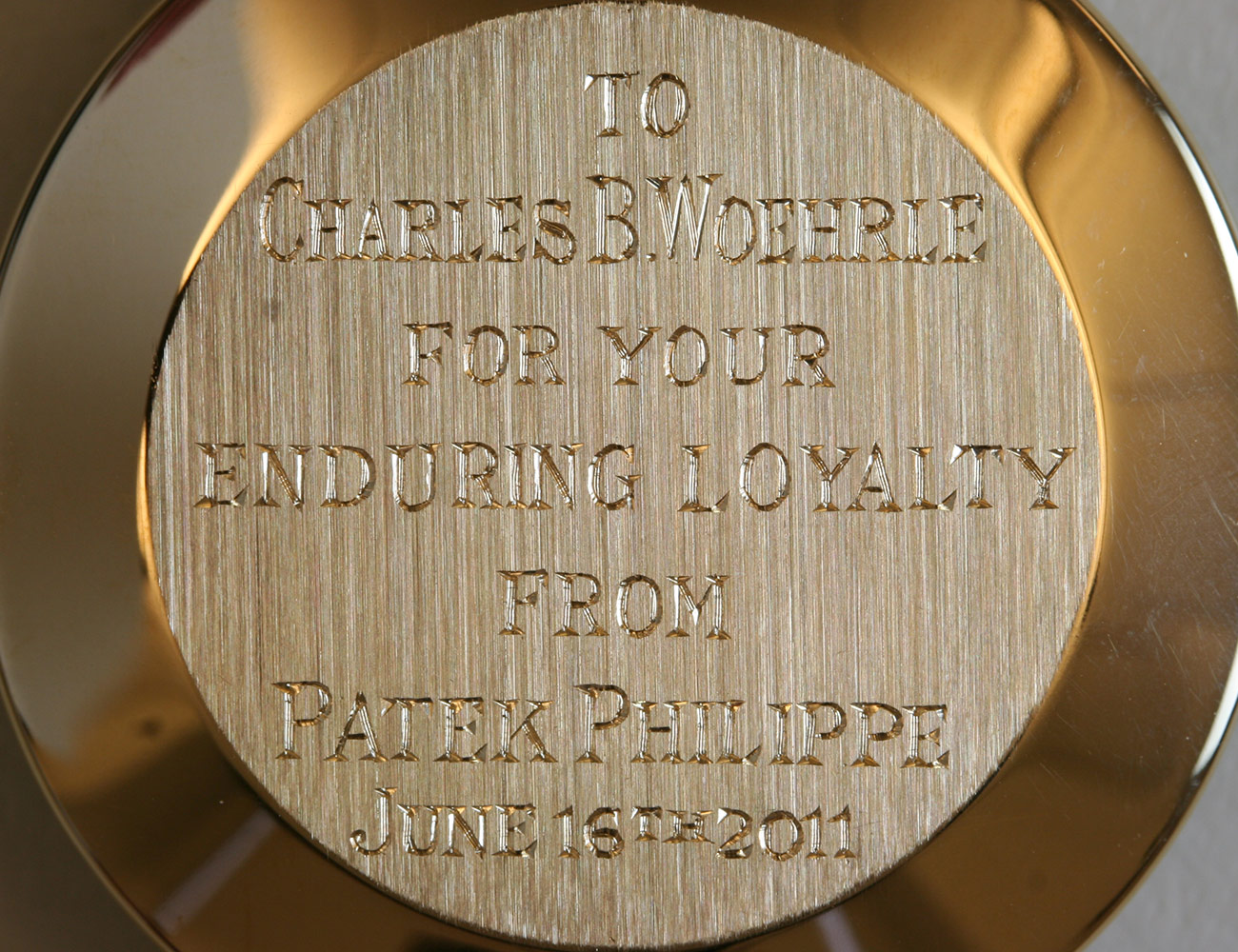 “Let me tell you a story about a watch,” he said, and recounted the entire chain of events. Moved, Louise decided to try and see if she could trace the serial number of the watch, perhaps leading her to its current owner. She reached out to Larry Petenneli, President of Patek Philippe US who, after hearing the story, was eager to lend a hand. Realizing that someone might have purchased Woehrle’s 1461 from the thief not realizing it was stolen and have had the watch for several decades already, the two decided not to pursue tracking it down. Instead, Mr. Petenneli checked with his colleagues and with Mr. Thierry Stern himself, President of Patek Philippe, who agreed to gift a similar watch in yellow gold to Woehrle.