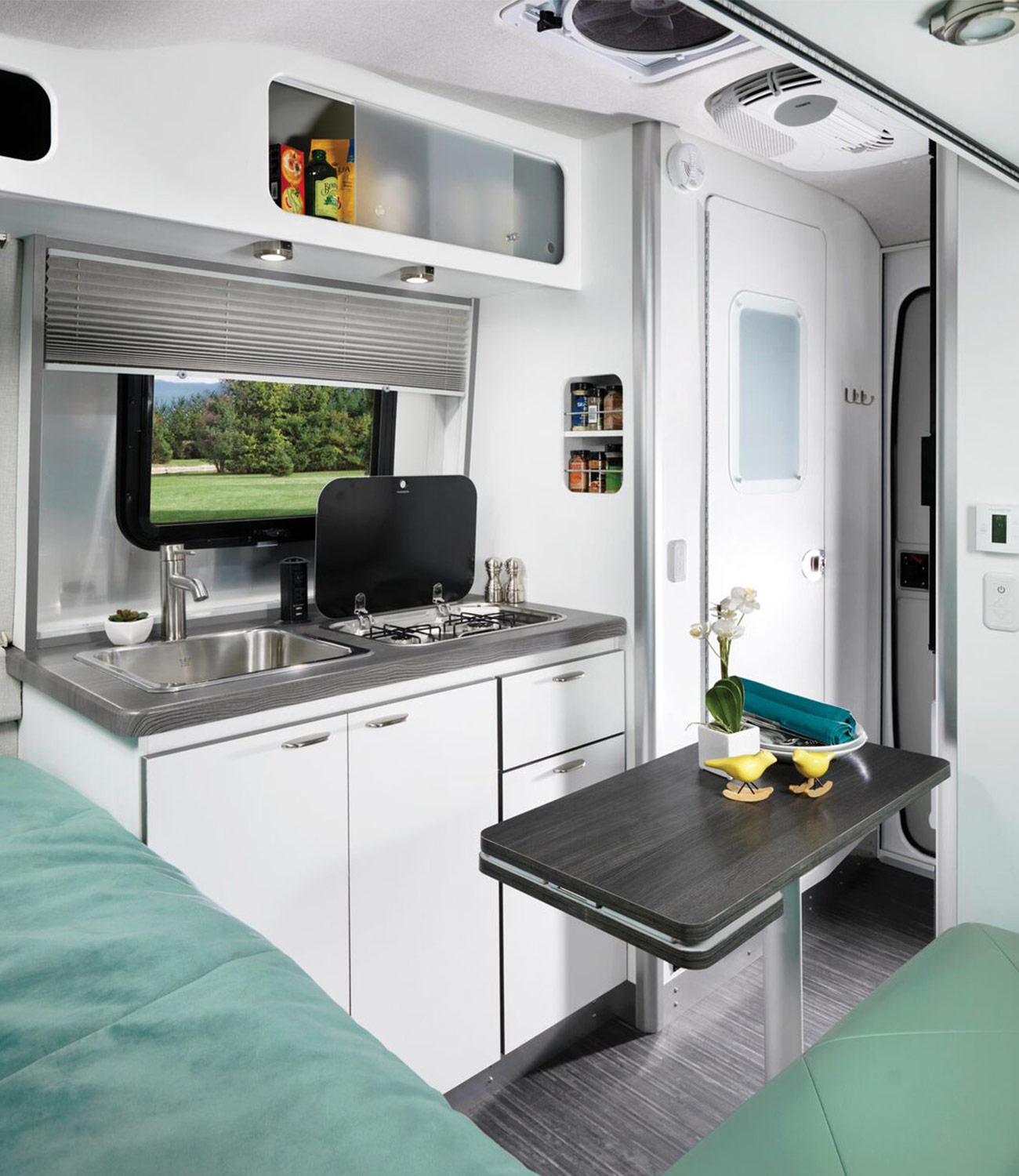 Watch Out For: Airstream has long enjoyed a reputation for interior quality and craftsmanship, so I was a bit surprised to find a couple of red flags inside the Nest. The fridge door was latched into place before my drive but fell completely off its hinges at some point during my four-hour highway commute, leaving hardware and a few groceries splayed out on the floor. Additionally, I found that the galley’s upper cabinets had slid their way open during the drive, dropping some items from the pantry.