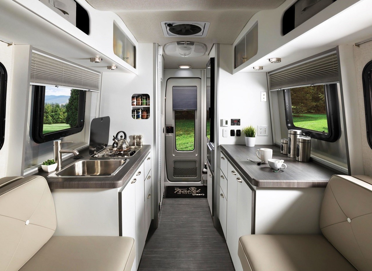 A small kitchen inside offers all the necessities, including a sink, gas dual-burner, large worktop, microwave, and 91L electric fridge. Next to the kitchen is a wet bath and the wardrobe is placed in the opposite corner.