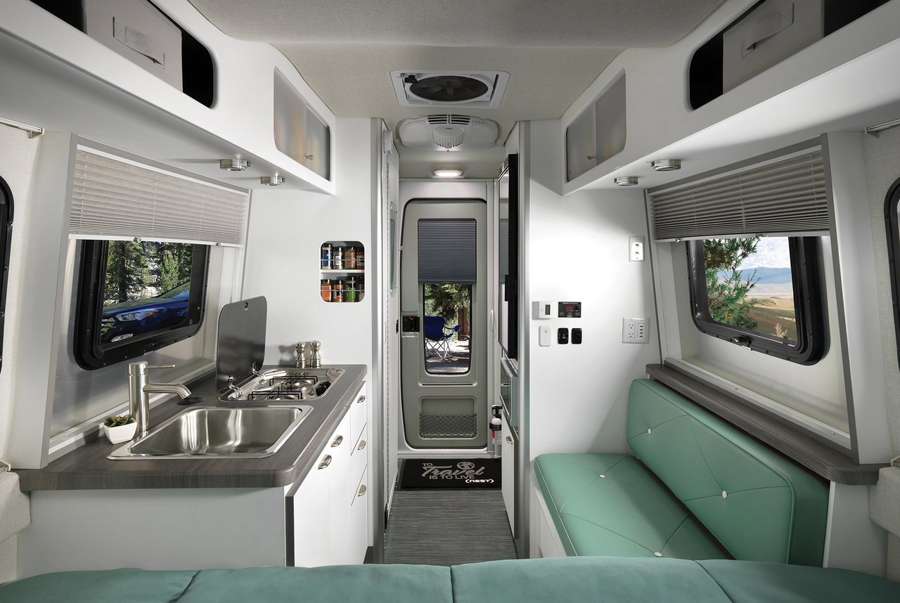 The Nest can carry up to 600 lb inside its two-tone fiberglass shell. It rides on aluminum wheels with 16-in Goodyear Endurance tires and has a torsion suspension axle, standard brakes, LED taillights, and spare tire. Entrance is done via a back door, while a total of six windows bring light into the two-person interior which is available in two-floor plans – one with a sofa-bed/dining area and a second with a fixed Tuft & Needle mattress and a small bench.