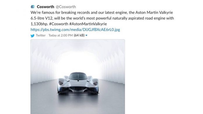 A tweet by Cosworth (who evidently jumped the gun with this announcement) has confirmed that the Aston Martin Valkyrie is set to benefit from the world’s most powerful naturally aspirated road engine. The British engineering firm have confirmed, via social media, that the Valkyrie’s 6.5-litre V12 lump will get 1,130 bhp.