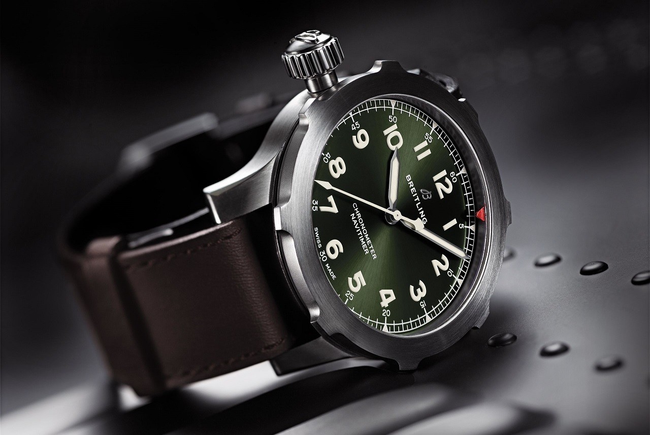Boasting a hefty 46 mm case in titanium with a military green dial or stainless steel with black dial, the timepiece has a distinctive bidirectional rotating bezel and a prominent crown found on the left side of the case for added wrist comfort. The dials feature large, luminescent Arabic numerals and anti-reflective convex sapphire crystals, while the hour & minute hands are also luminescent, allowing for easy reading in all lighting conditions.
