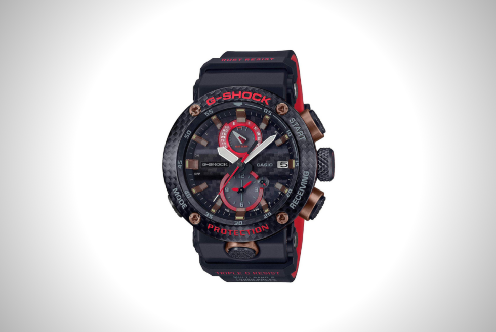 A common feature among regular G-SHOCK watches are the huge bumpers that surround the bezel. These absorb most of the accidental impacts but might turn off potential buyers. Hence, to make the Gravitymaster look like a traditional wristwatch without sacrificing protection, clever workarounds are in place. To make the case virtually-indestructible, Casio is using a mix of carbon fiber and a special resin for a lightweight 50 mm case. The strap, on the other hand, is carbon fiber.