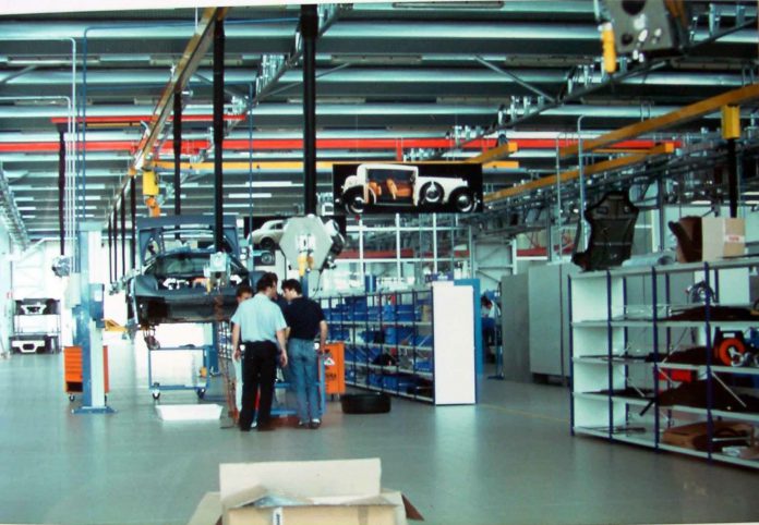 The factory was designed from the ground up with the worker and flexiblity in mind. Thick prefabricated concrete EB-branded slabs form the outer walls of the two factory halls. They are angled in such a way that they keep sunlight and heat out, while adjacent glass running between the concrete slabs from the floor to the ceiling and across the roof let in enough daylight to ensure a comfortable working climate. Inside all buildings there are hardly any fixed walls allowing the factory to be adapted to the needs at any time. Most components for the EB 110 including the engine were produced in-house and Romano Artioli wanted customers to be able to see the production process of their cars.