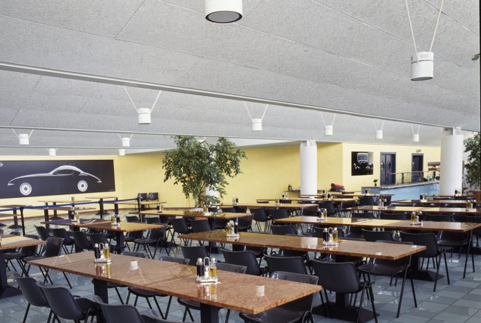 Romano Artioli could regularly be seen on his bicycle going from one department to the next for meetings and updates. In the back of the building is the canteen. “Here” says Enrico and points to an old wooden door from the original factory in Molsheim that wasn’t taken away after the bankruptcy. Upstairs in the dining room where workers and management had lunch together there are two art works on the wall that also survived. “Removing them would make them disintegrate into a hundred pieces like a Swiss highway vignet” Enrico continues.
