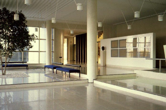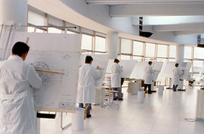 The design offices and administration are located at another building near the entrance of the factory. The circular showroom on the ground floor and the two floors with design offices are supported by concrete pillars on the outside with a large open space in the middle and glass windows all around. The design studio had an advanced lighting system that factored in light from outside to create similar lighting throughout the day. Romano Artioli had a modest office with adjacent meeting room right above the main entrance of the building.