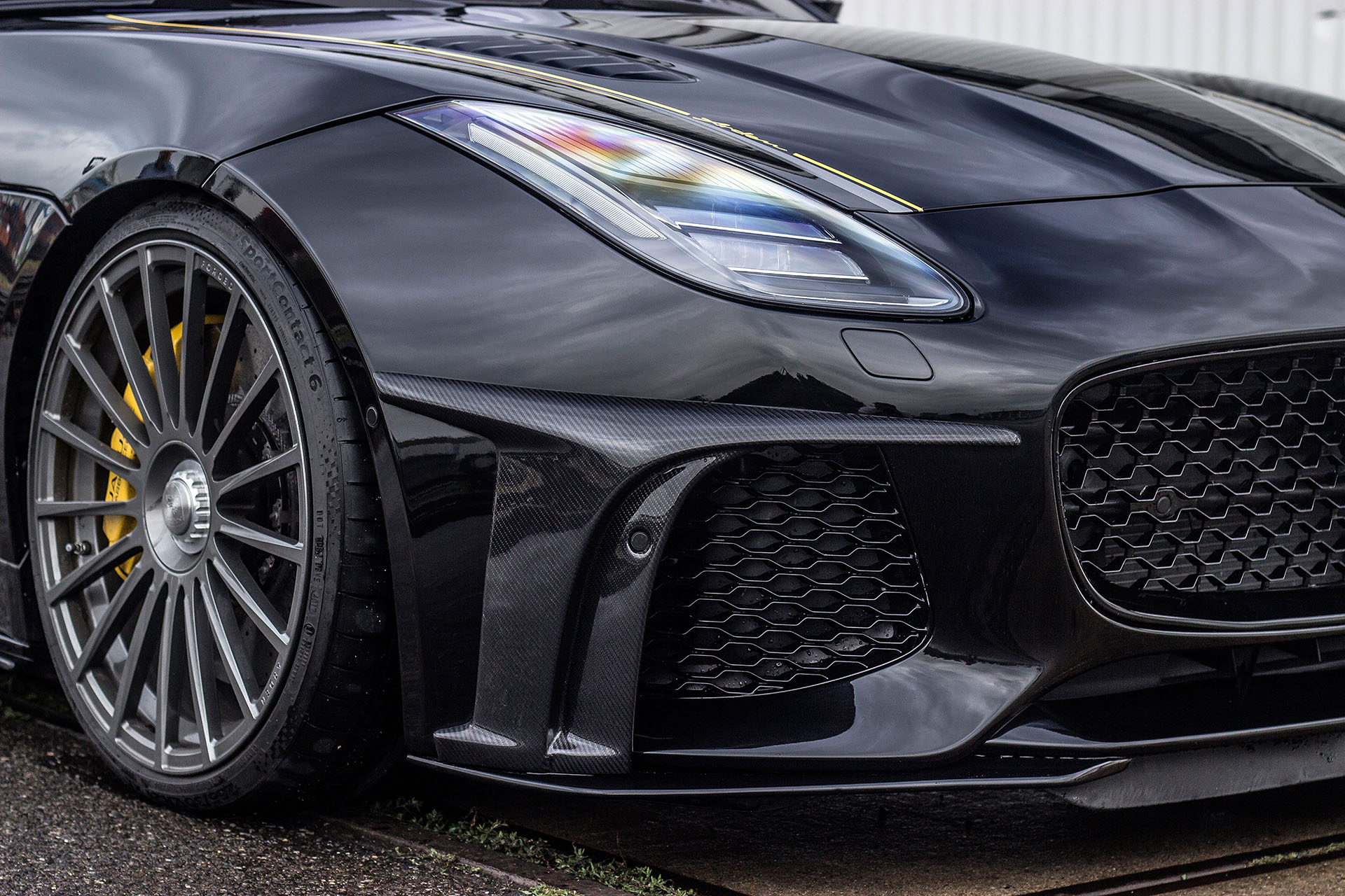 Furthermore, Arden offers a set of add-on splitters for the original Jaguar SVR front bumper for a more distinctive, wider front look while still retaining the factory original parking sensors, also available in clear carbon fiber? They can be enhanced by installing the Arden side sills, complete with their optional, vertical fin ahead of the rear wheels, and to complete the look you just need to add the additional fins for the rear bumper … the rear wing you see on this car is actually factory original from Jaguar on the F-Type SVR edition.