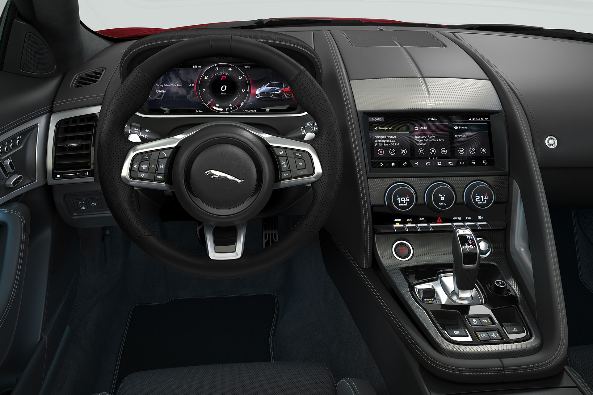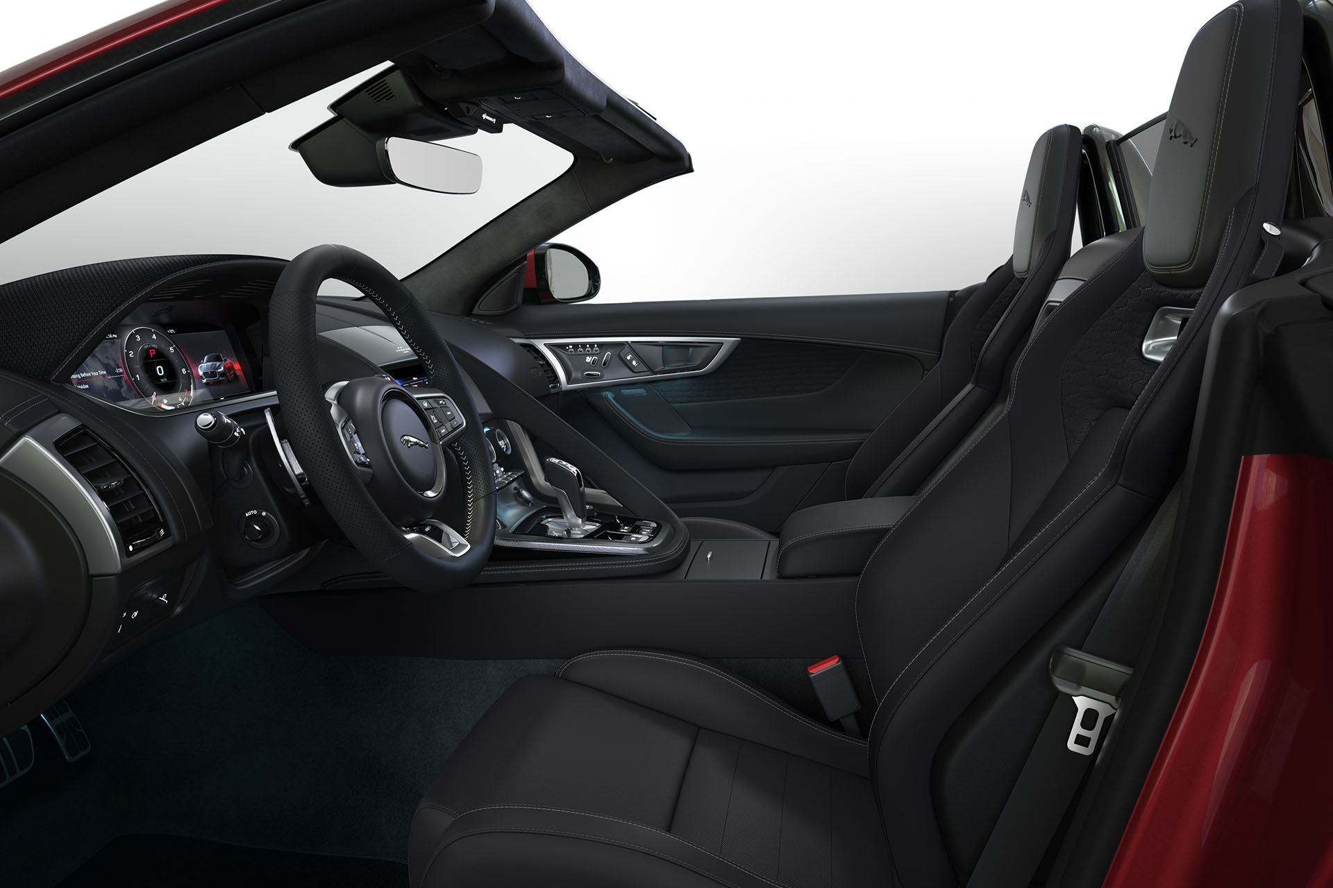 The same monogram design is used to emboss the suede cloth wrap for the 12.3-inch reconfigurable Interactive Driver Display, while other refinements include satin-finish aluminum gearshift paddles, an Ebony suede cloth headliner, and illuminated treadplates featuring the Jaguar script.