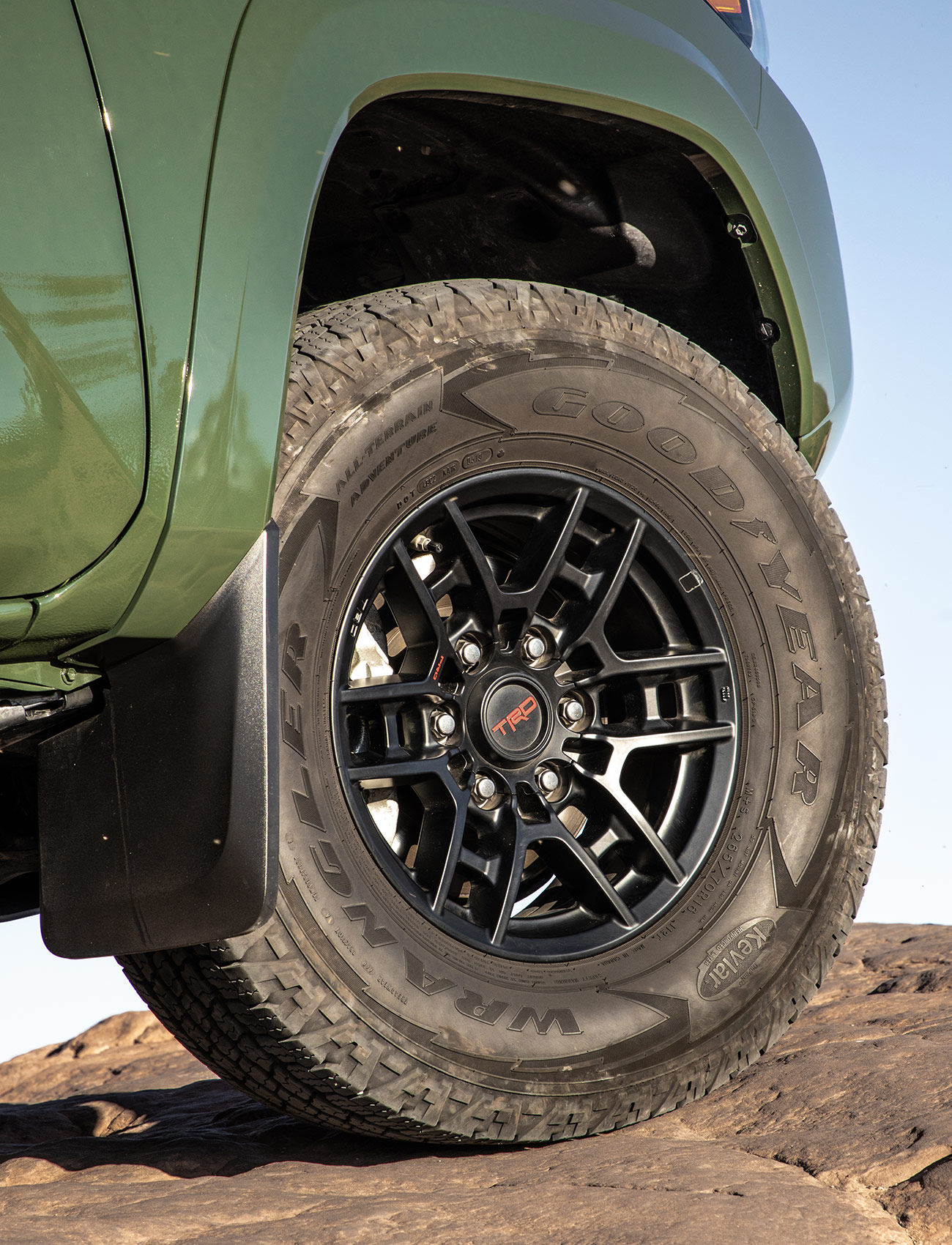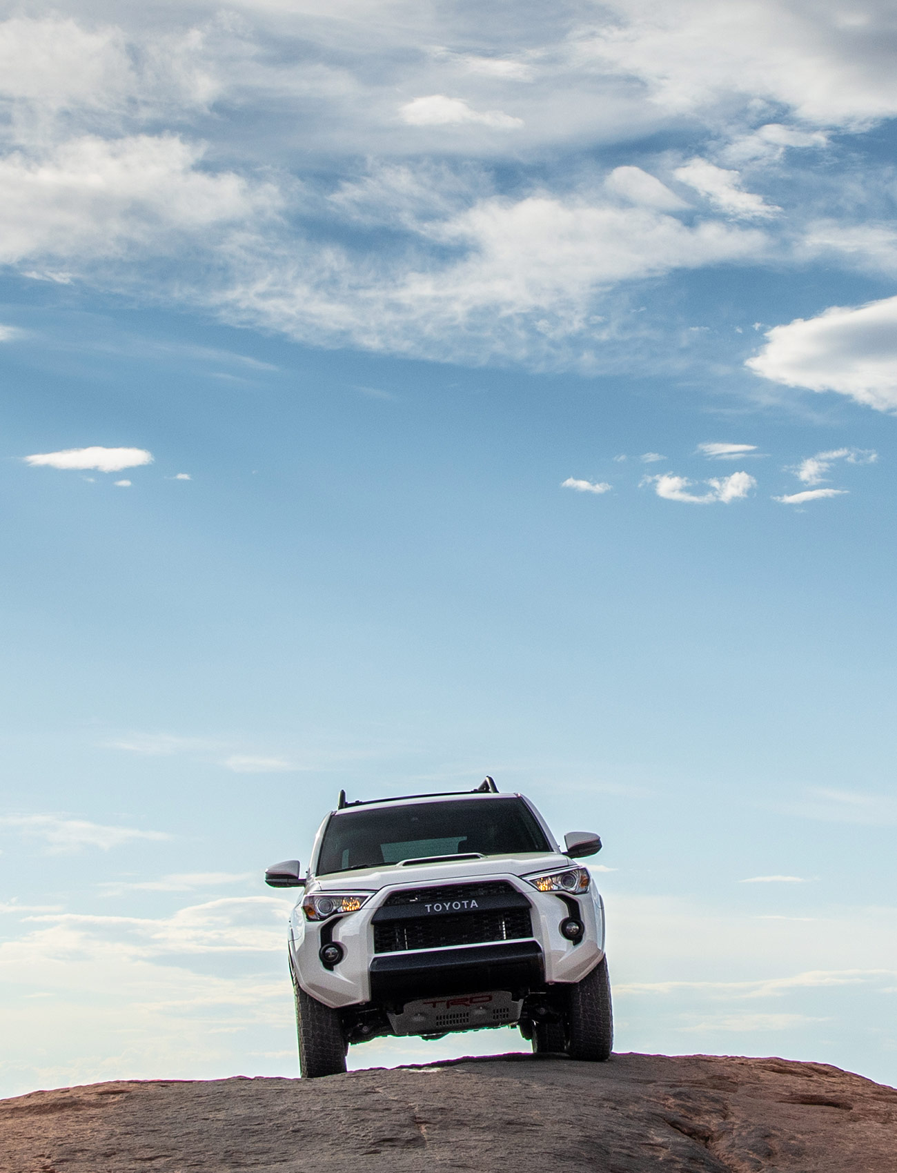 The short wheelbase of the 4Runner meant no trailer hitches kissed the umber Utah rocks. The lengthier Tacoma Double Cab, however, did make contact at a few points, albeit briefly — and no real damage was done. On Hell’s Revenge, the Taco shone bright, its surefooted prowess demonstrating why it’s such an icon in these conditions. It also enjoys the same lifted suspension and Fox shocks as the $Runner, and the 3.5-liter V6 mill good for 278 horsepower and 265 lb-ft of twist keeps you clambering forth with ease. Goodyear Wrangler All-Terrain Adventure 16-inch tires impart impeccable grip, even in slippery spots.