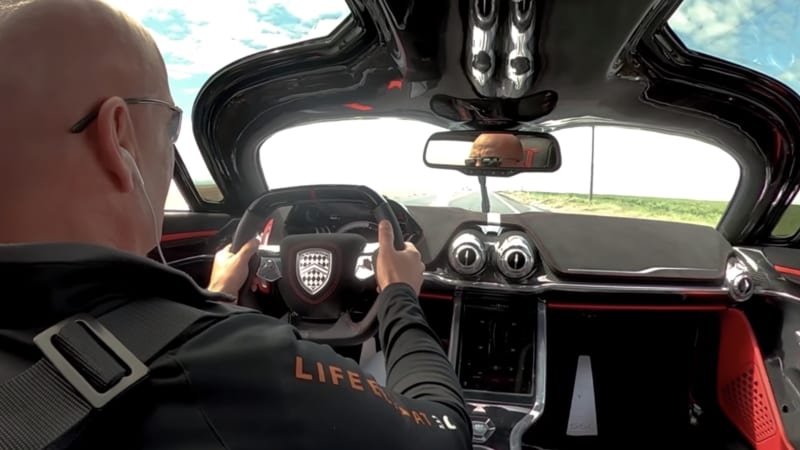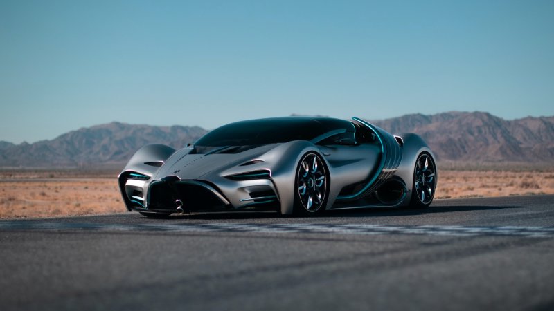 The chassis and bodywork is entirely carbon fiber, a central carbon tub and modular spaceframes laid on a rigid carbon spine connect the front to the rear. Outside, the Le Mans-like fin houses a retractable LIDAR system up front and a cross-shaped taillight in back. Built as a road-legal racer for gearheads and sitting just 3.7 inches off the ground, there’s an adjustable pushrod suspension with automatic ride-height adjustment, 14-inch carbon ceramic rotors with six-piston calipers in front and four-piston in the rear, and a pair of 19-inch center-lock wheels up front paired with 20-inchers in back.