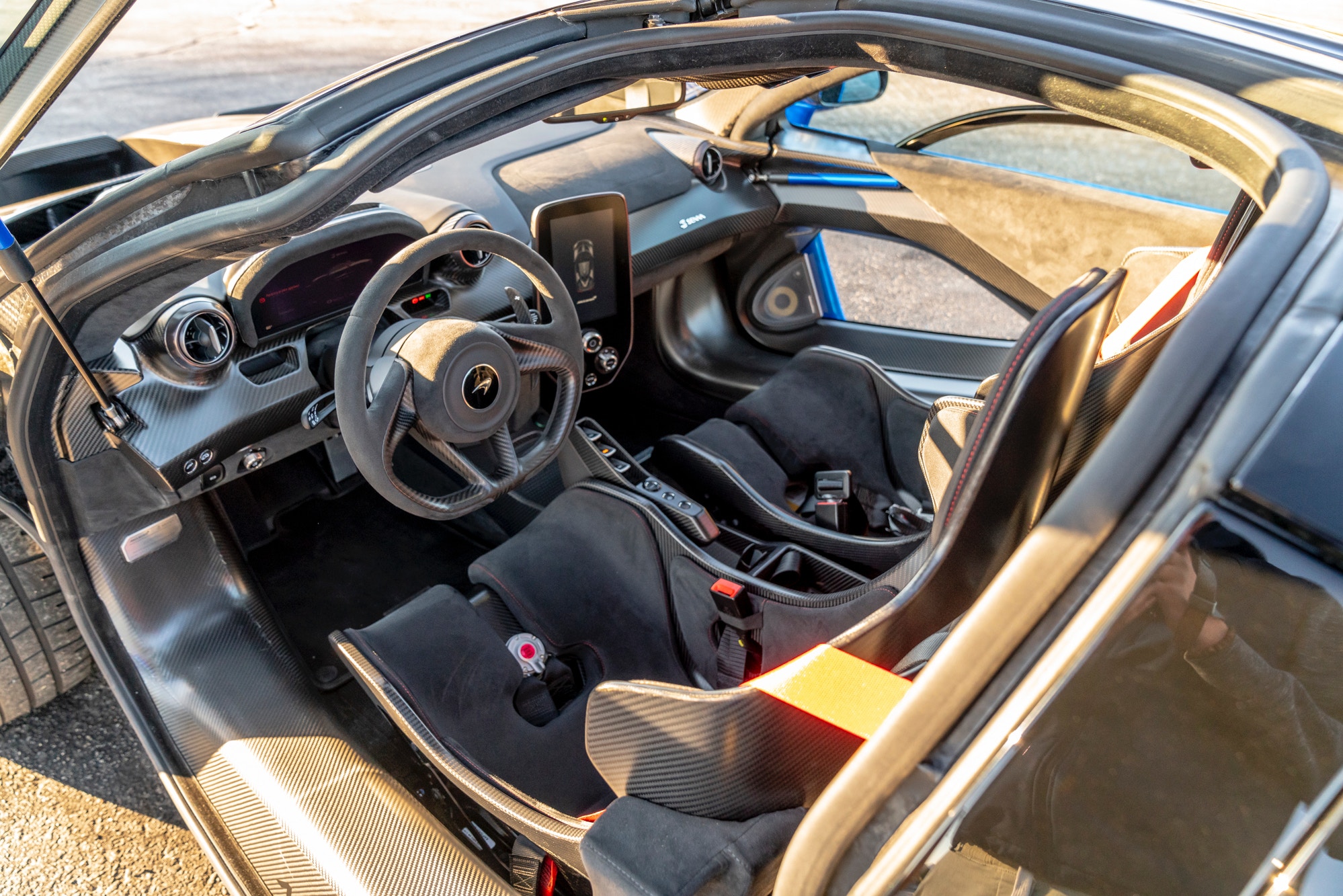 For the interior, this Senna’s carbon-fiber Touring size seats are covered in “Carbon Black Alcantara” with red contrast MSO Bespoke stitching and contrasting red seatbelts to match. It also has six-point racing harnesses.