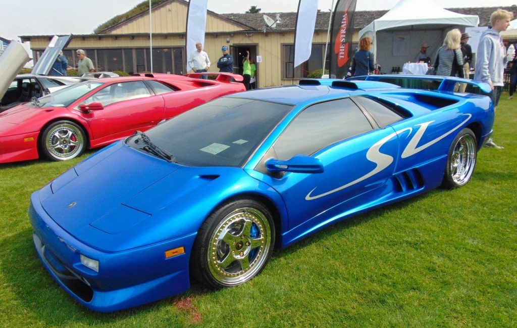 On this knoll side in every direction were thrilling Lamborghinis. I picked a direction and right there was a medium-dark-blue 1998 Diablo SV (1995-2001) sporting chrome wheels and exhaust pipes each with gold trim. SV means “super veloce”, which in Italian means very fast, connoting the top end of a model line. The rear spoiler and racy low planar lines made the Diablo look especially scintillating.