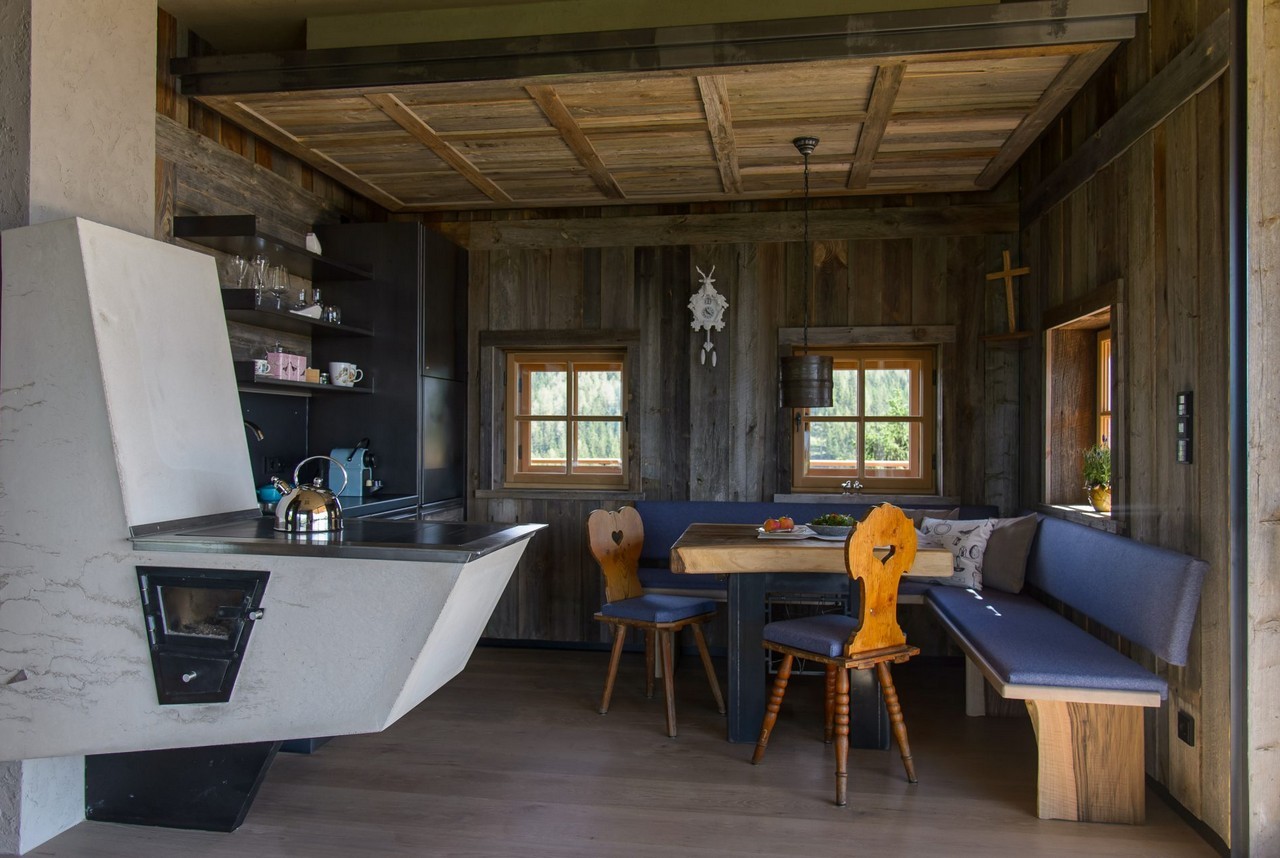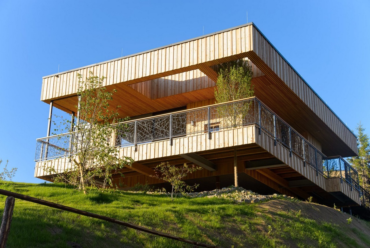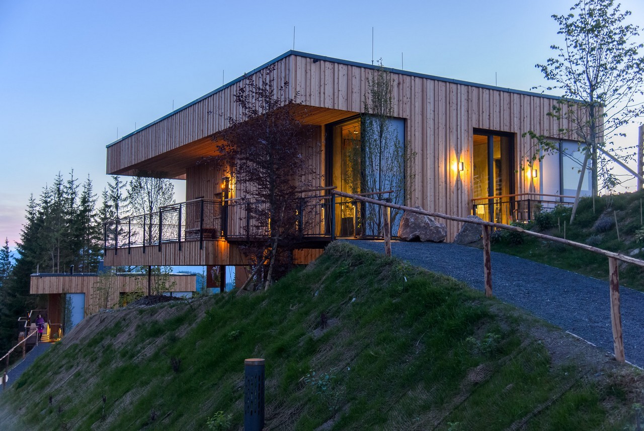 Entering the chalets is done through parking lots placed underneath the buildings. The interiors are clad in materials recycled from old farmhouses; they use geothermal energy for heating the floors and walls.