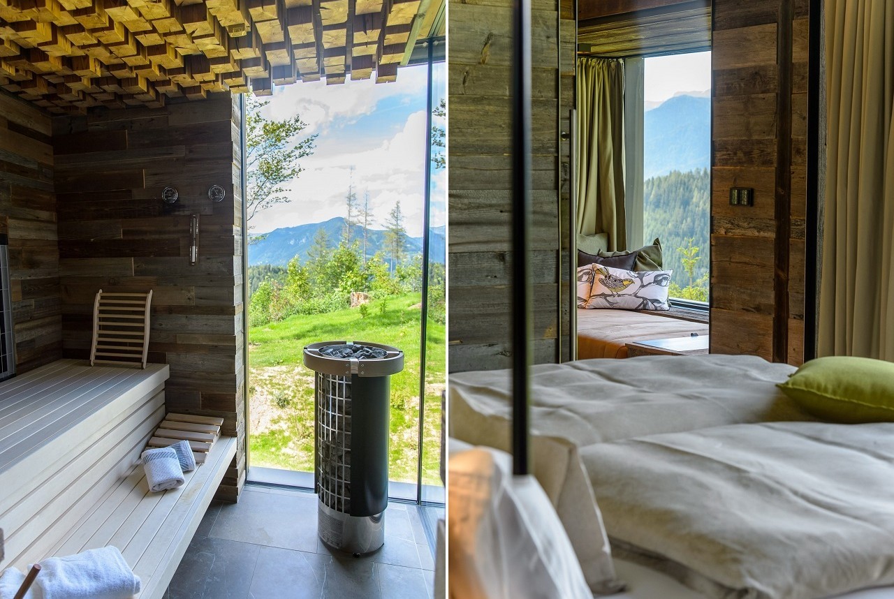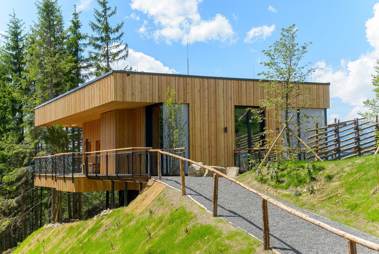 The four cabins function as an extension to the highly-awarded restaurant “Wirtshaus Steirereck.” Each of them has a steel and point foundation, a superstructure made of timber and other natural materials, façade and window frames shaped from local larch wood, and an extensive green roof.