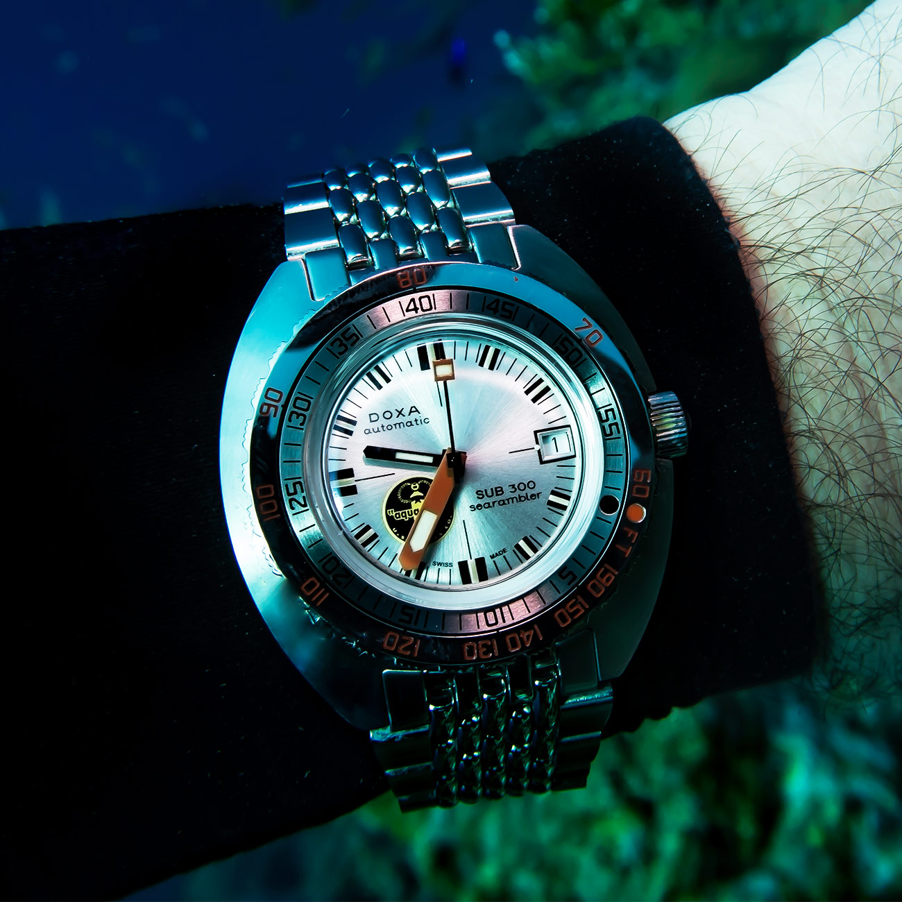 Doxa was also the first to put the US Navy’s no-decompression (no-deco) scale on the bezel. This now-patented feature gives a diver an instant reference of how long they can dive at any given depth without making a decompression stop. This was critical stuff in the era before the dive computer, and it was boldly apparent to me when diving that the mechanical Doxas are as much data-spewing computers as they are merely watches.