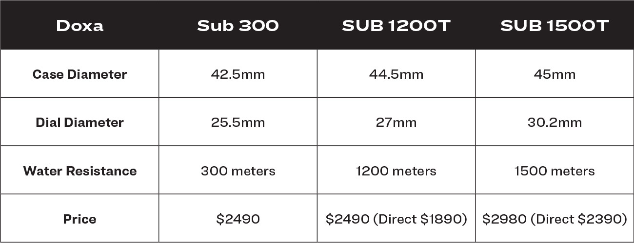 Though there are chronographs and all sorts of other models to consider, the SUB 300, SUB 1200T and SUB 1500T form the core of Doxa’s current lineup. Each is available in three classic dial colors (plus a slew of even more limited editions, but good luck finding one).
